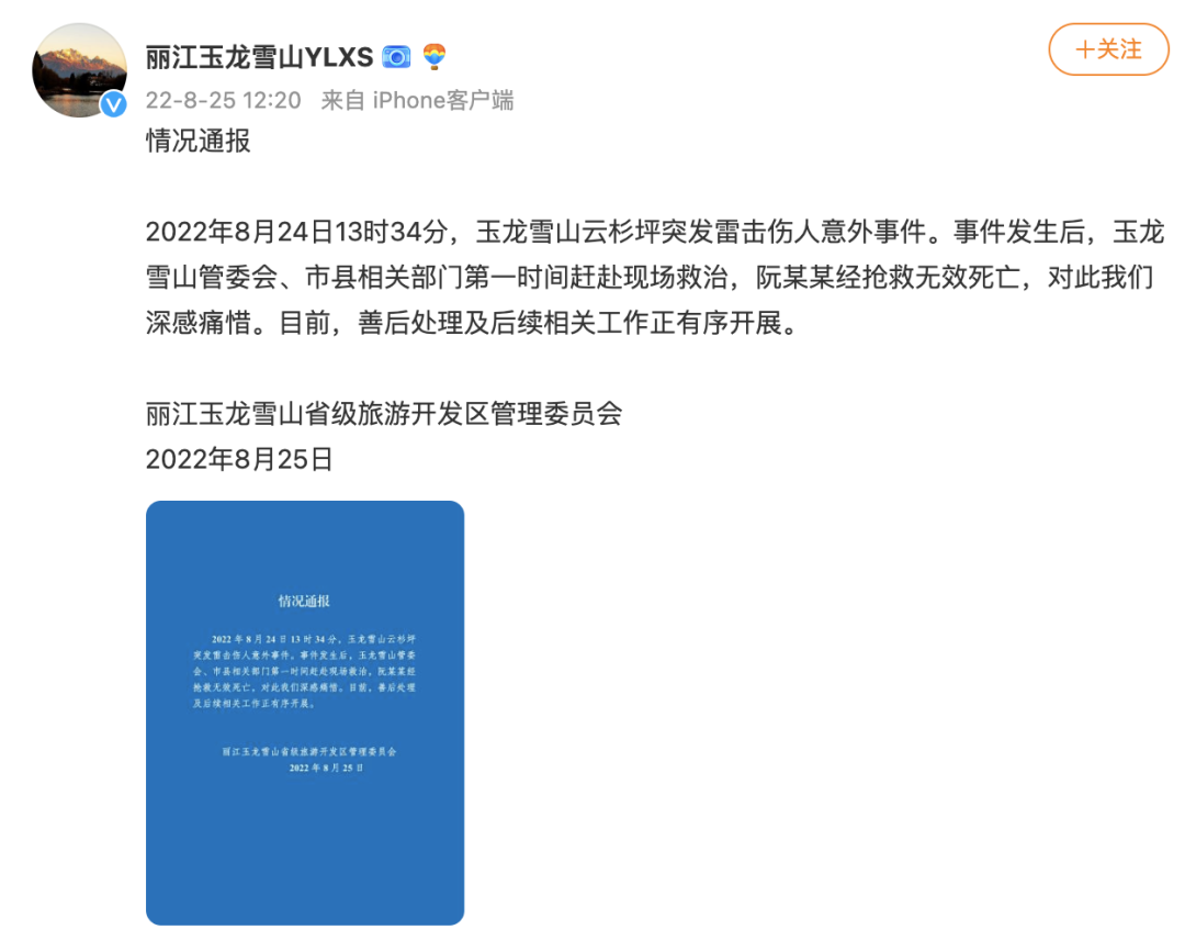 2022年8月24日13时34分,玉龙雪山云杉坪突发雷击伤人意外事件。事件发生后,玉龙雪山管委会、市县相关部门第一时间赶赴现场救治,阮某某经抢救无效死亡,对此我们深感痛惜。目前,善后处理及后续相关工作正有序开展。