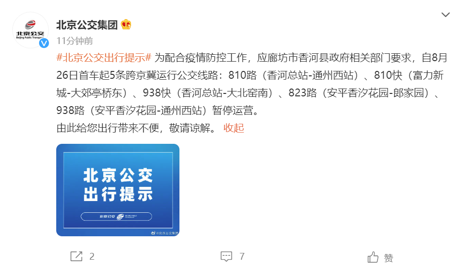 据@北京公交集团 消息,为配合疫情防控工作,应廊坊市香河县政府相关部门要求,自8月26日首车起5条跨京冀运行公交线路:810路(香河总站-通州西站)、810快(富力新城-大郊亭桥东)、938快(香河总站-大北窑南)、823路(安平香汐花园-郎家园)、938路(安平香汐花园-通州西站)暂停运营。