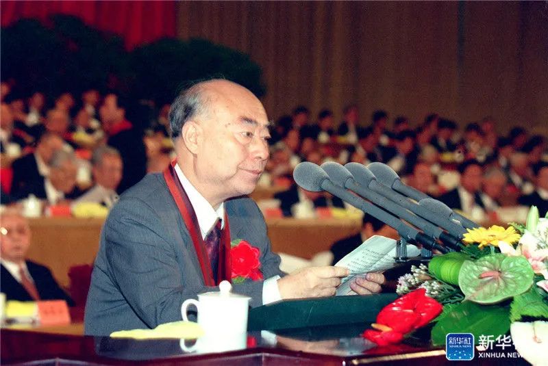 △1999年9月18日,中共中央、国务院、中央军委在北京人民大会堂隆重举行表彰为研制“两弹一星”作出突出贡献的科技专家大会。这是参加“两弹一星”研制的科学家代表、“两弹一星功勋奖章”获得者于敏在大会上发言。新华社记者 王新庆 摄