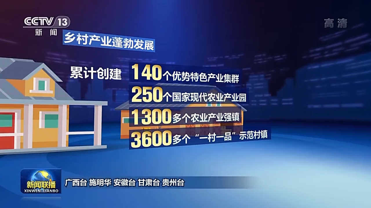 如今,乡村产业蓬勃发展。累计创建140个优势特色产业集群、250个国家现代农业产业园、1300多个农业产业强镇、3600多个“一村一品”示范村镇;脱贫地区特色产业稳步发展,832个脱贫县每个县已初步培育2—3个优势突出、带动能力强的主导产业。