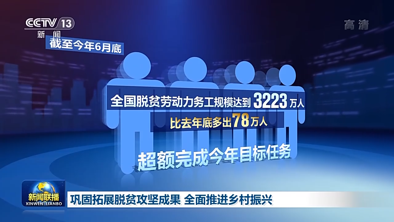 截至今年6月底,全国脱贫劳动力务工规模达到3223万人,比去年底多出78万人,超额完成今年目标任务。预计上半年脱贫县农村居民人均可支配收入增速仍将继续高于全国平均水平。