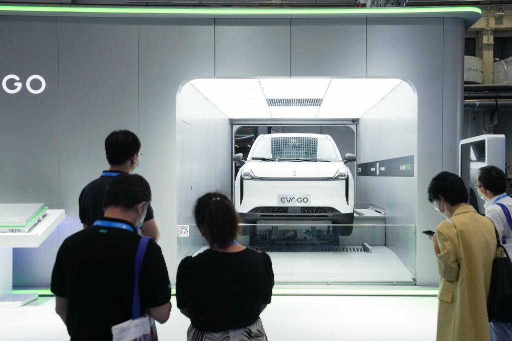 8月26日,2022世界新能源汽车大会上,参观者在观看一辆可换电池新能源汽车的换电演示。新华社记者 鞠焕宗 摄