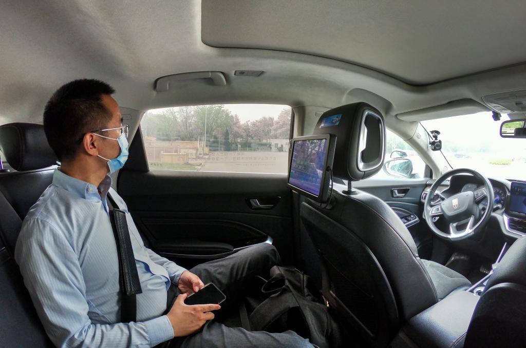 4月25日,在北京经济技术开发区,一名乘客在体验“主驾无人、副驾驶配备安全员”的无人驾驶车。新华社记者 彭子洋 摄