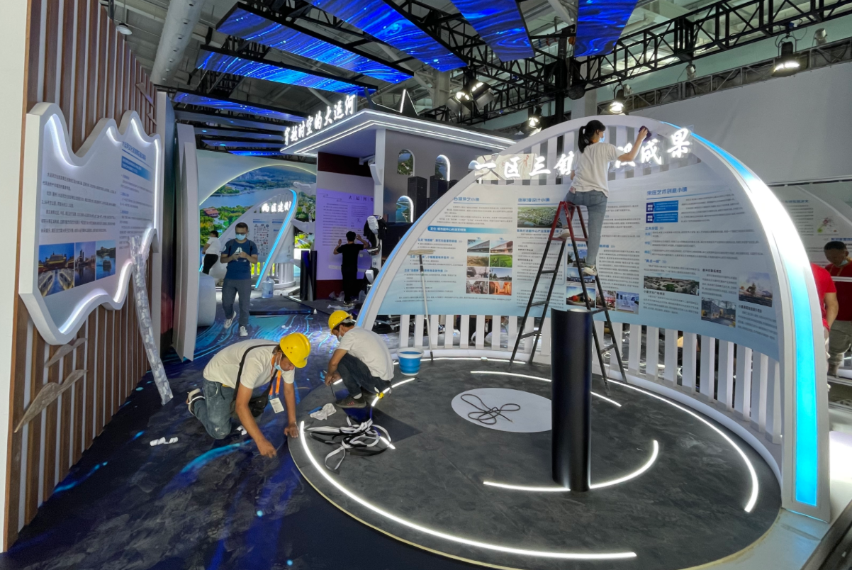 城市副中心展台位于2号馆,现场布展正在冲刺收尾。地面上深蓝色的纹路明亮雅致,模仿出大运河波光粼粼的水面。记者看到,城市副中心展台主要设置了两区建设展示、大运河历史文化展示、副中心三大特色小镇等方面内容。其中,来自副中心的元宇宙企业蓝色宇宙还将向观众展示虚拟线上商业街区。