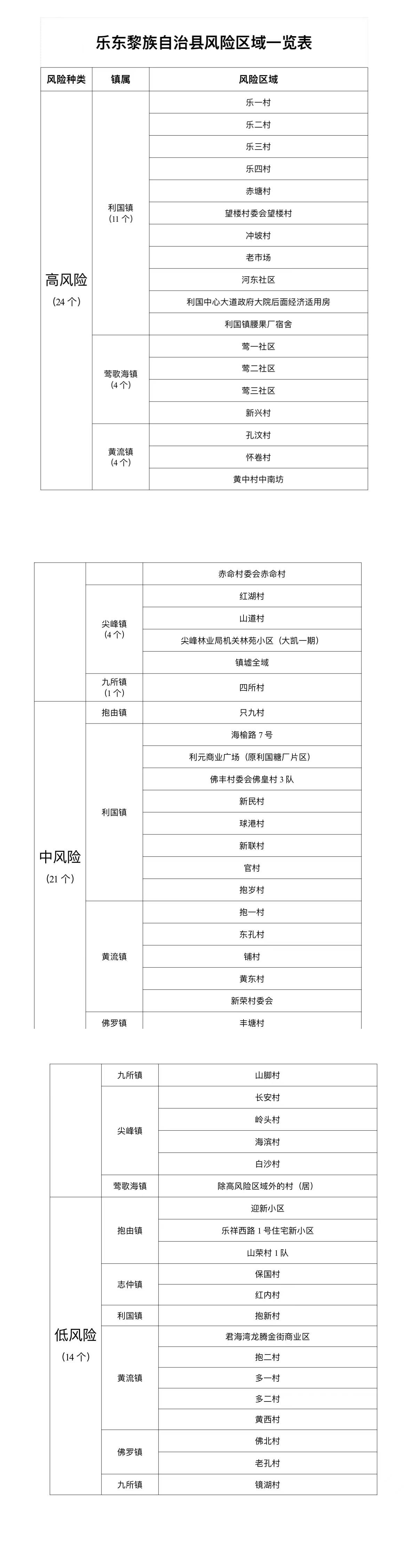 1.利元商业广场(原利国糖厂片区)、佛丰村委会佛皇村3队、海榆路7号、新民村、新联村、官村、球港村、抱岁村由高风险区调整为中风险区。