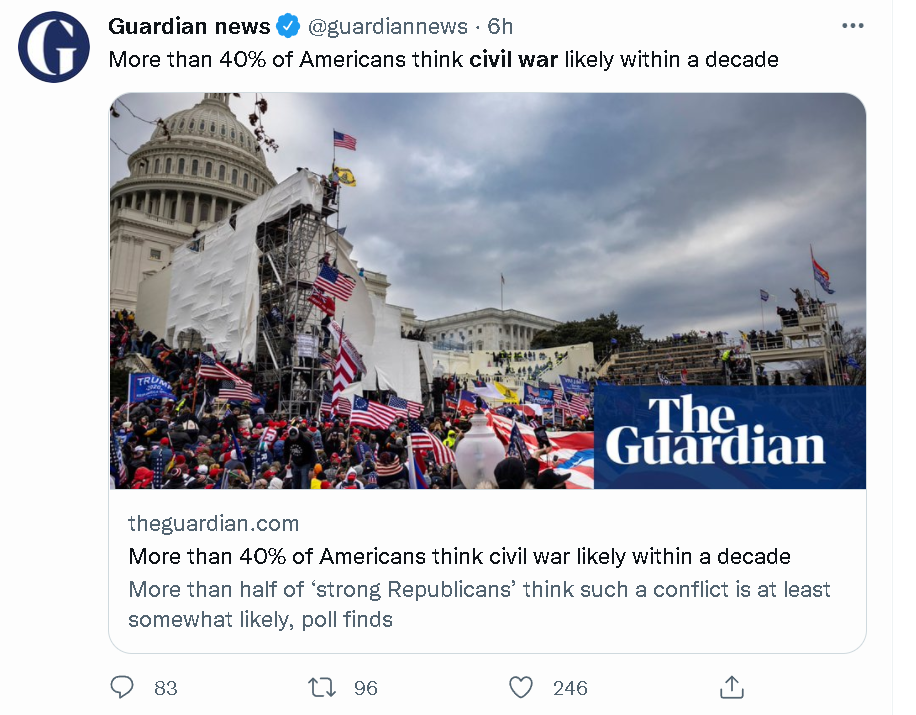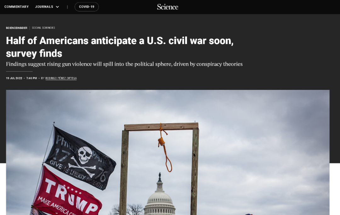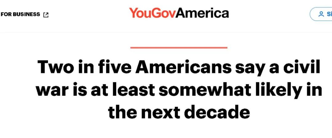 《卫报》指出,这并不是最近唯一一份得出这一悲观结果的民意调查,比如美国《科学》杂志上月的一篇报道就指出,一项来自美国加州大学相关机构在今年5月13日至6月2日面向8620名美国受访者的民意调查就发现,超过半数受访者(50.1%)认为“未来几年美国会爆发内战”,而且有6768名受访者认为通过暴力达成政治目的在某种程度上是可行的。这项民调认为,这反映出美国人对于美国民主社会及其相关机构的疏远与不信任正在加剧。