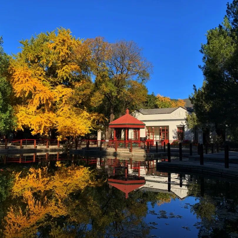 香山之秋以香山“静宜园二十八景”之首景——勤政殿为主体,搭配香山秋季最具有代表性的植物景观——红叶、松柏,以及标志性建筑之一的琉璃万寿塔,体现了香山皇家园林文化。