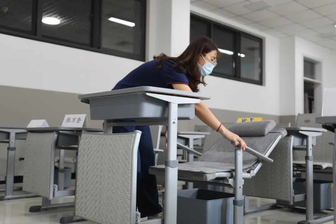 老师检查桌椅情况。