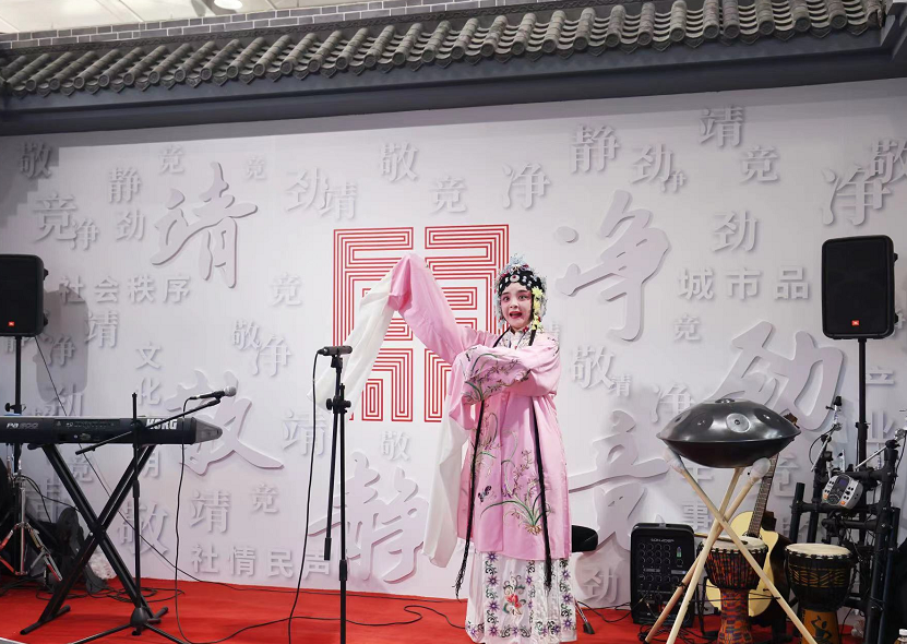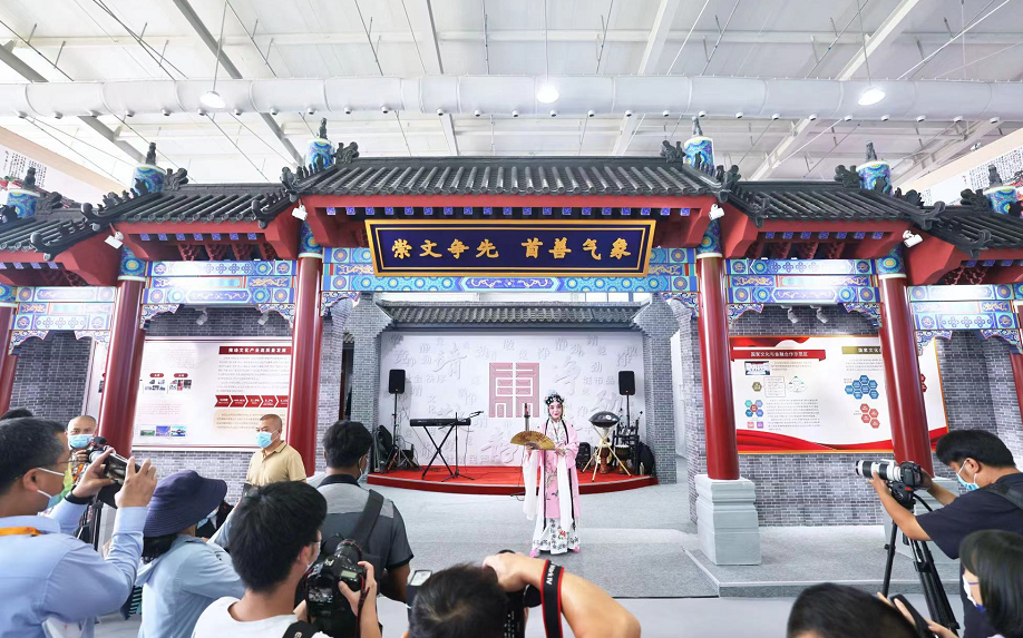 “崇文争先 首善气象”,东城展区前,牌楼上这八个字分外有气势。穿过牌楼,仿佛进入位于四合院里的会馆,戏台上戏曲演员扮相华美,唱腔动人。