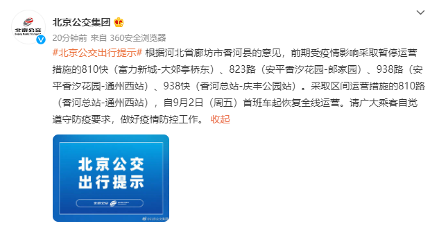 记者从北京公交集团获悉,根据河北省廊坊市香河县的意见,前期受疫情影响采取暂停运营措施的810快(富力新城-大郊亭桥东)、823路(安平香汐花园-郎家园)、938路(安平香汐花园-通州西站)、938快(香河总站-庆丰公园站),采取区间运营措施的810路(香河总站-通州西站),自9月2日(周五)首班车起恢复全线运营。请广大乘客自觉遵守防疫要求,做好疫情防控工作。