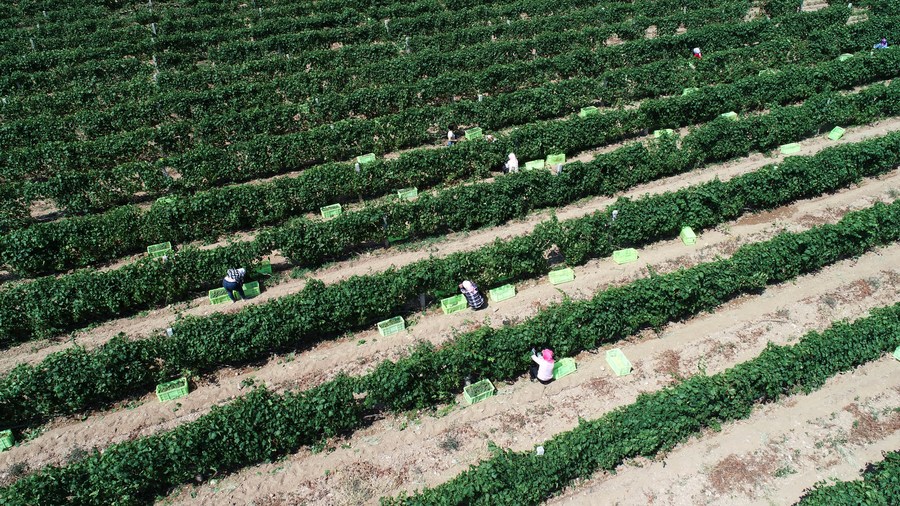 游客在银川市永宁县闽宁镇棚湖湾红树莓基地采摘红树莓(2021年9月4日摄,无人机照片)。新华社记者 王鹏 摄