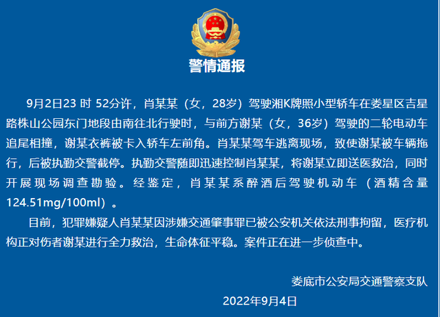 9月3日,有网友爆料,湖南娄底一宝马女司机疑似酒驾撞人,拖行被撞者近1公里。9月4日,娄底市公安局交通警察支队发布通报:9月2日23时52分许,肖某某(女,28岁)驾车与前方谢某(女,36岁)追尾相撞,谢某衣裤被卡入轿车左前角。肖某某驾车逃离现场,致使谢某被车辆拖行,后被执勤交警截停。经鉴定,肖某某系醉酒后驾驶机动车。目前,肖某某因涉嫌交通肇事罪已被公安机关依法刑事拘留,案件在进一步侦查中。