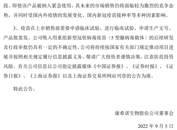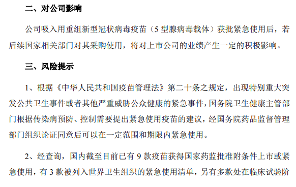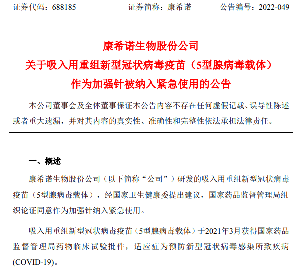 据康希诺生物股份公司在上交所网站发布的最新公告显示,该公司研发的吸入用重组新型冠状病毒疫苗(5型腺病毒载体),经国家卫生健康委提出建议,国家药品监督管理局组织论证同意作为加强针纳入紧急使用。