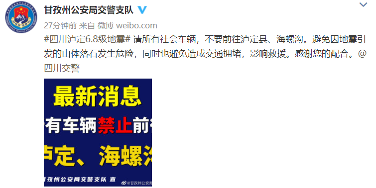 甘孜州公安局交警支队官微发布提醒:所有社会车辆,不要前往泸定县、海螺沟。避免因地震引发的山体落石发生危险,同时也避免造成交通拥堵,影响救援。感谢您的配合。