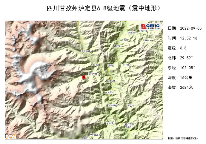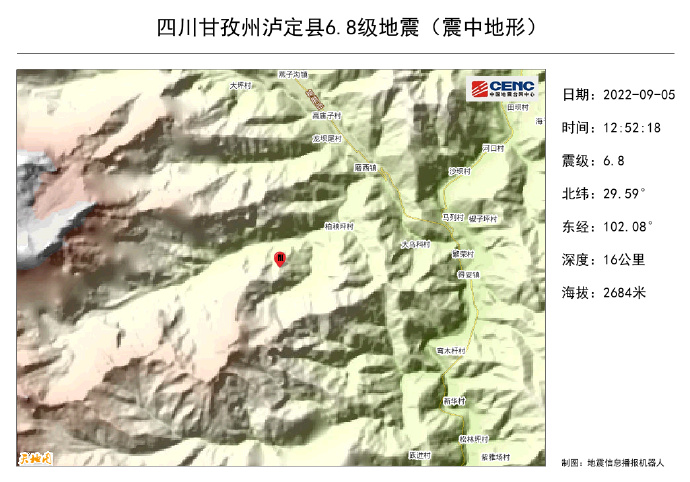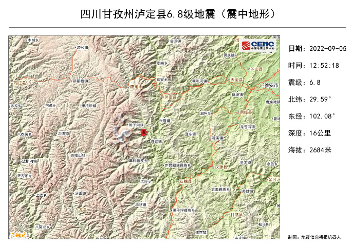 中国地震台网正式测定:9月5日12时52分在四川甘孜州泸定县(北纬29.59度,东经102.08度)发生6.8级地震,震源深度16千米。