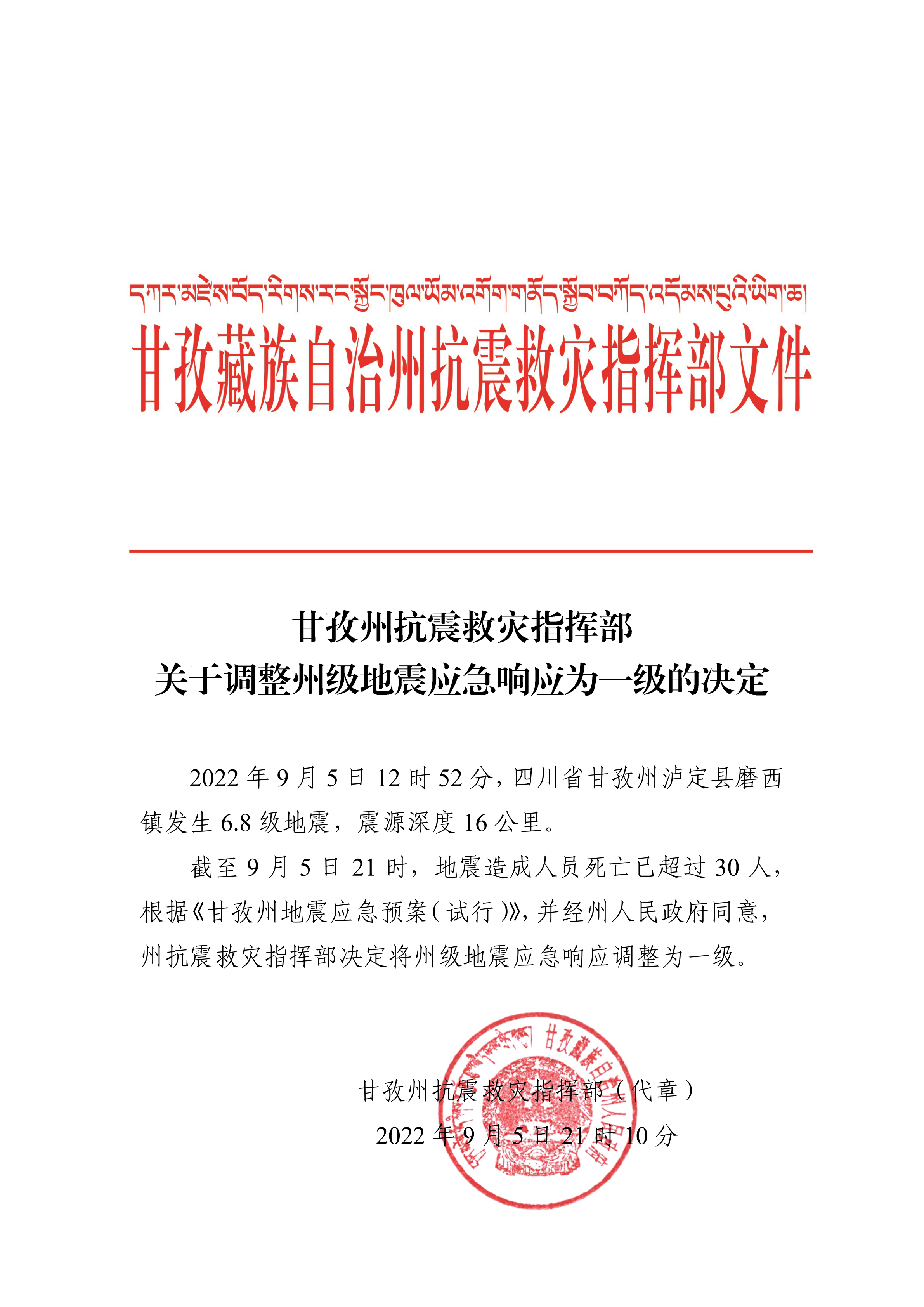 针对四川甘孜州泸定县6.8级地震造成的严重灾情,根据《四川省自然灾害救助应急预案(试行)》规定,省减灾委决定将四川省自然灾害二级救助应急响应提升为一级救助应急响应。