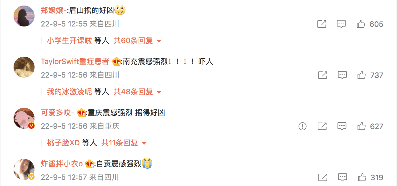 截至2022年9月5日15时00分共记录到M3.0级及以上余震3次,其中6.0-6.9级地震0次,5.0-5.9级地震0次,4.0-4.9级地震1次,3.0-3.9级地震2次。