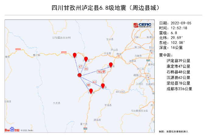 震中距泸定县城39公里、距康定市47公里、距石棉县48公里、距汉源县62公里、距荥经县78公里,距成都市226公里。