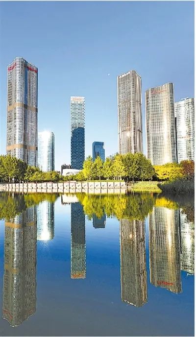 北京市朝阳区大望京科技商务创新区内的大望京公园,占地面积逾33公顷,风景秀美。图为楼宇倒映在大望京公园清澈的湖面上。