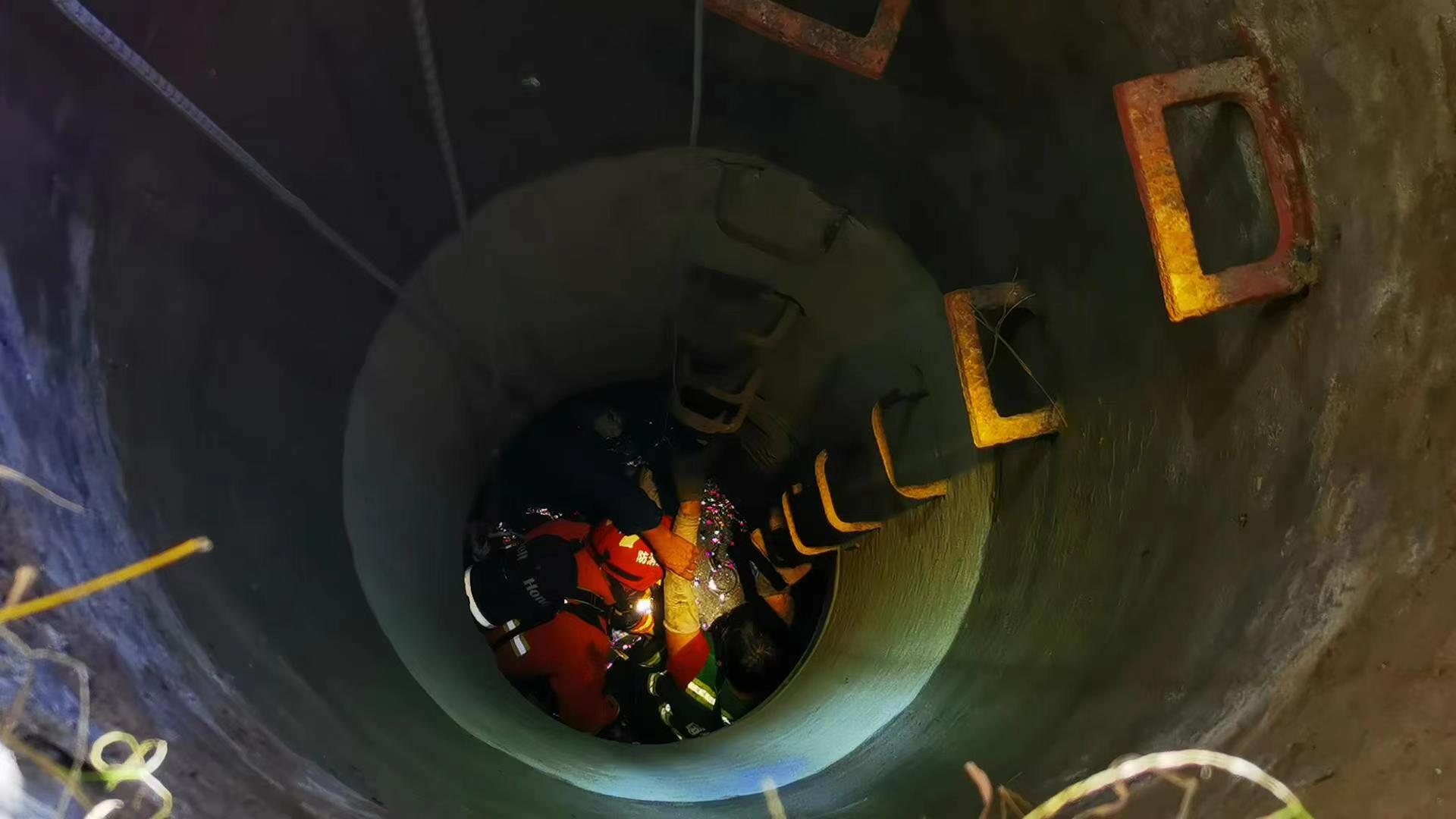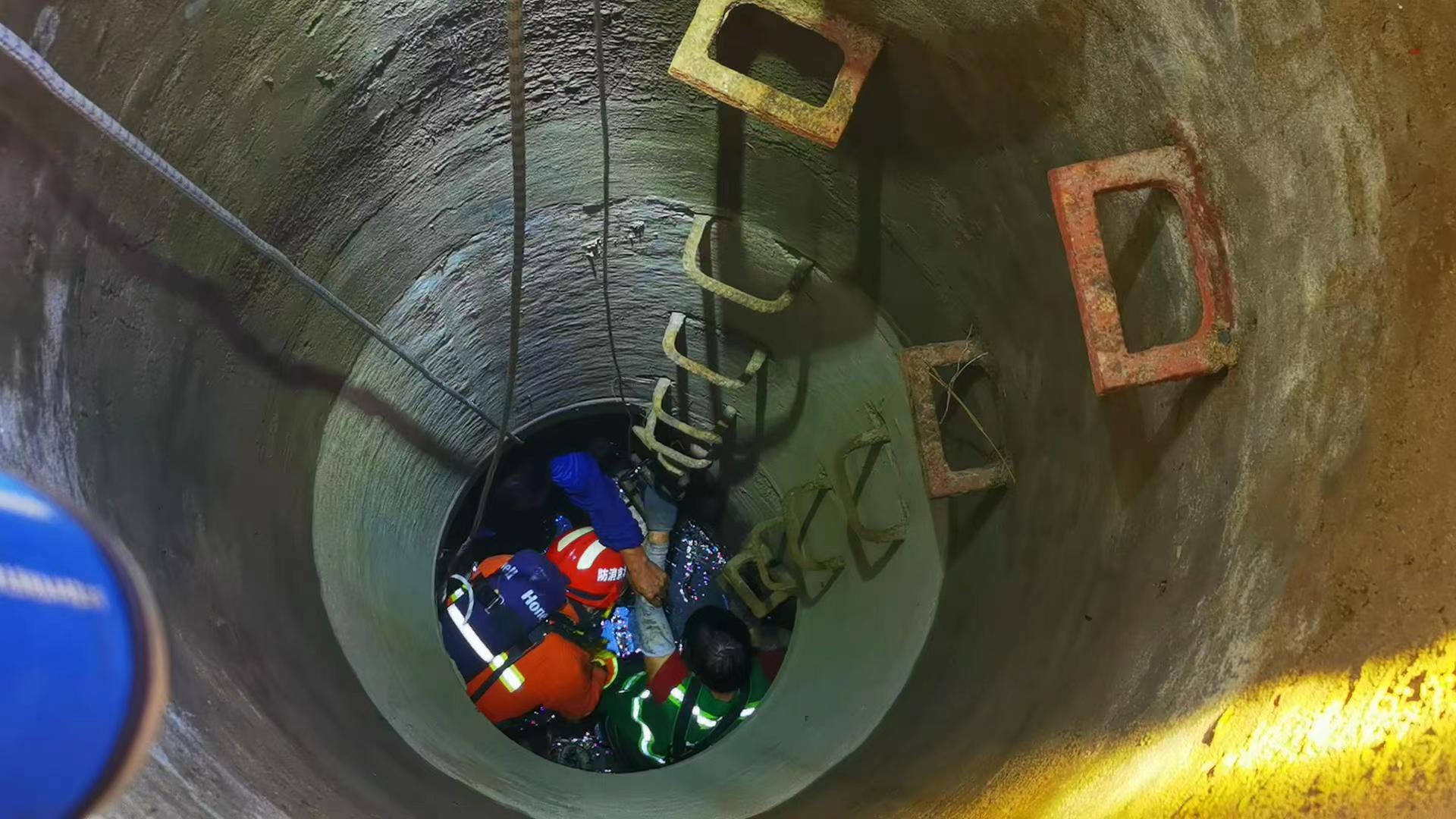 到场后,经消防救援人员勘查,污水井深约10米,井口直径约1米,井下共有2人被困。其中,1名女性在作业期间不慎坠入无盖污水井内,该名被困人员意识清醒,双腿及腰部不同程度受伤,无法行动;另1名男性被困者是该女子同事,得知女子掉井后,自己通过井壁的扶梯,下至井内救援时被困。