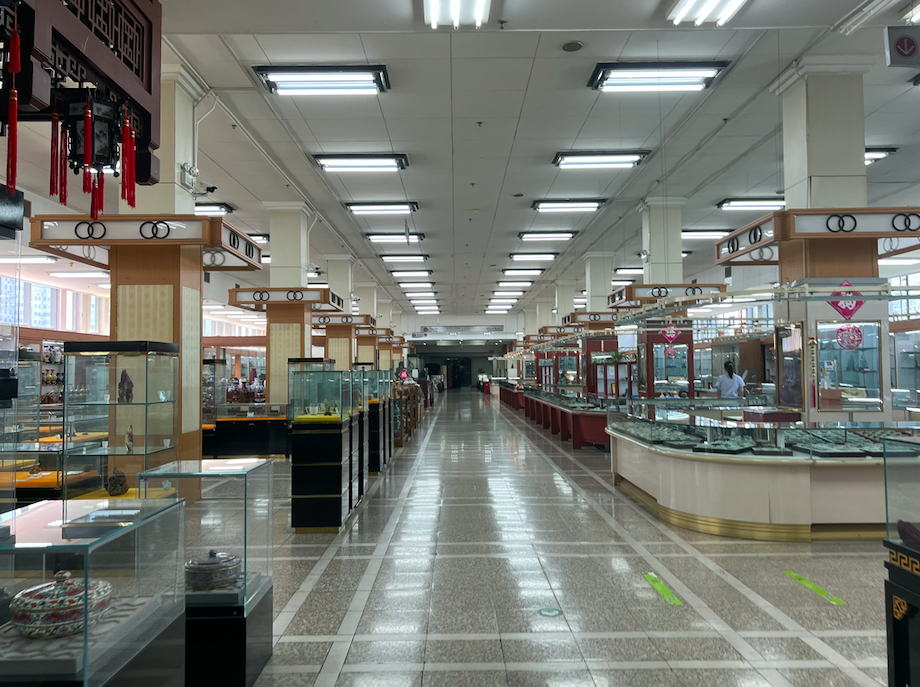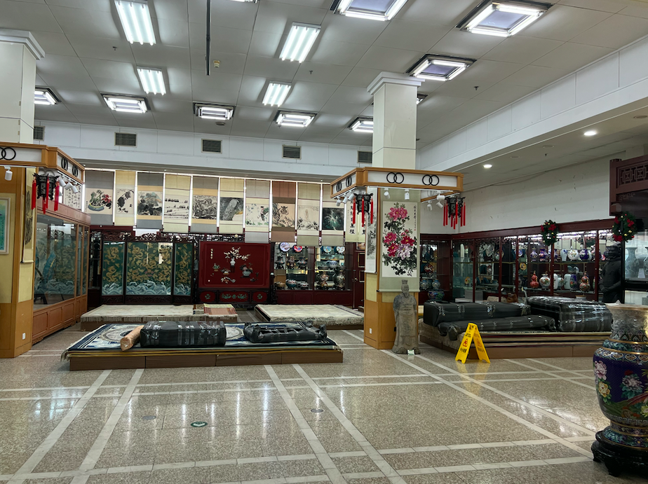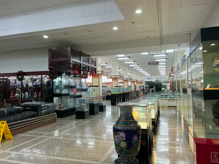 9月5日下午,记者从车水马龙的建国门外大街走进北京友谊商店,一股冷清感扑面而来。北京友谊商店共有四层,售卖珠宝烟酒、真丝制品、古玩字画和瓷器等商品,但偌大的商店难觅一位顾客。记者在现场看到,虽然售卖真丝制品的商铺很气派,货架上的瓷器、珠宝、玉器、石雕石刻等产品也种类丰富,但记者走访期间这里却无人问津。从一层走到四层,每层都十分安静,记者同时也发现,一些基础设施已经明显老化破损,如二层的商店楼层导览牌已经空白,没有内容,此外,楼梯间地板泛黄,灯光也比较昏暗。