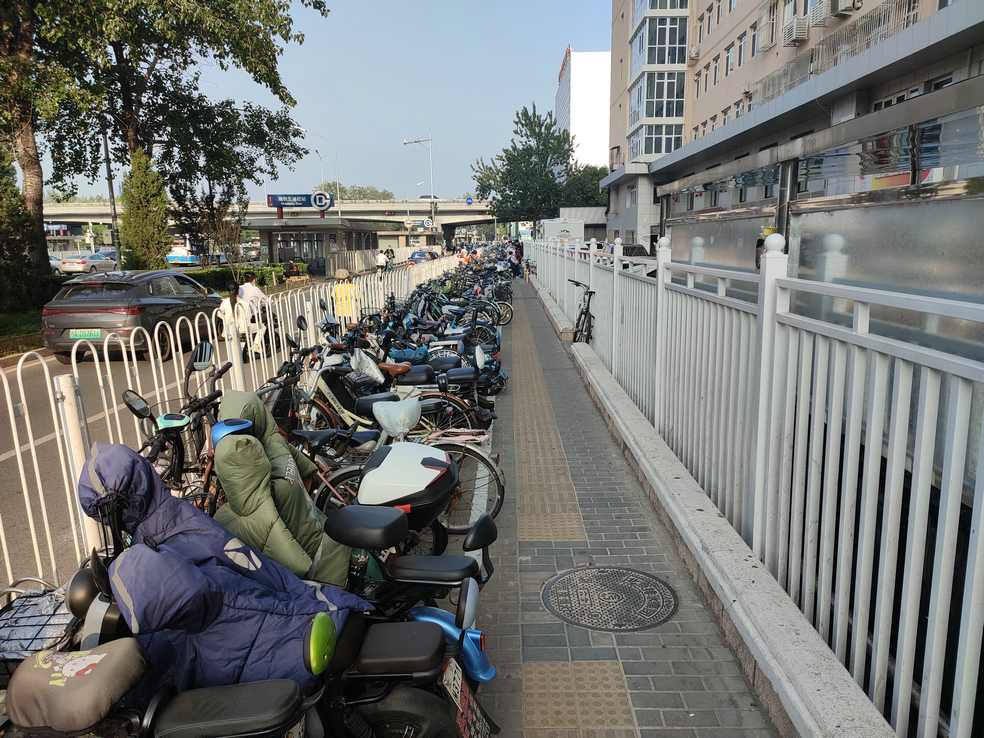 在百子湾,距离地铁站十几米远的地方,就有空闲的非机动车停车区,但就是懒得多走这十几米。很多骑车人,直接把共享单车甩在了非机动车道上。