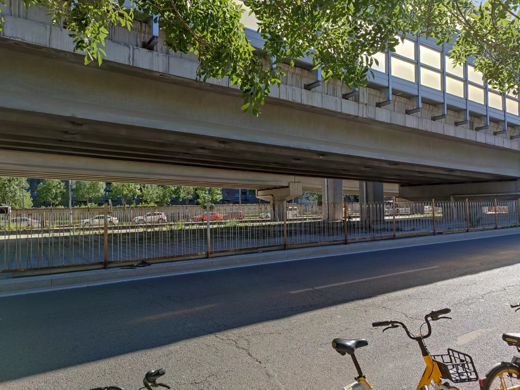 百子湾地铁站旁边,有空闲的桥下空间,但如果设置成停车区,取用非机动车的人们需要横穿机动车道
