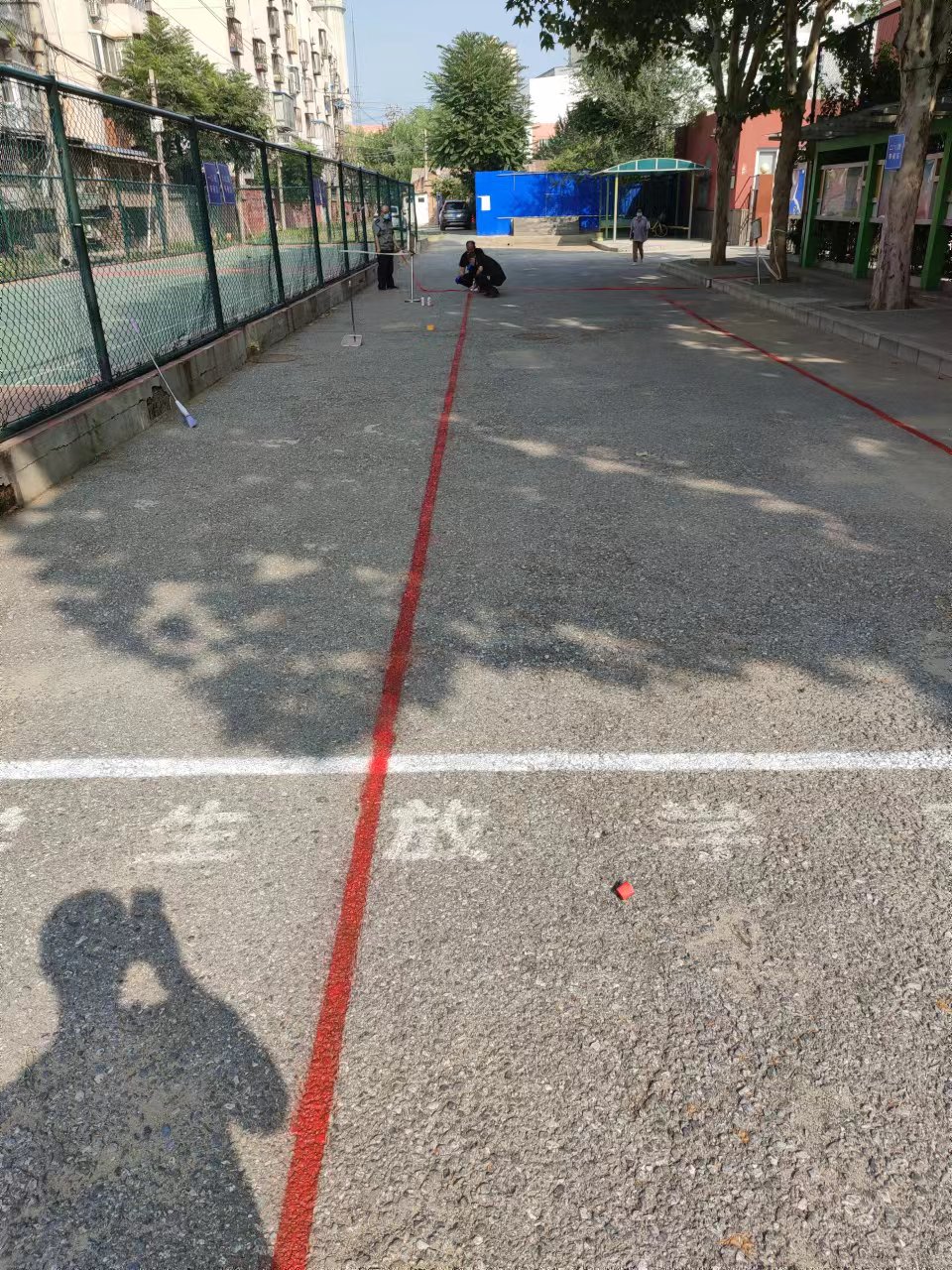 记者在成寿寺小学出入口采访时,正好赶上学校工作人员在重新施画接送学生的分区线条。