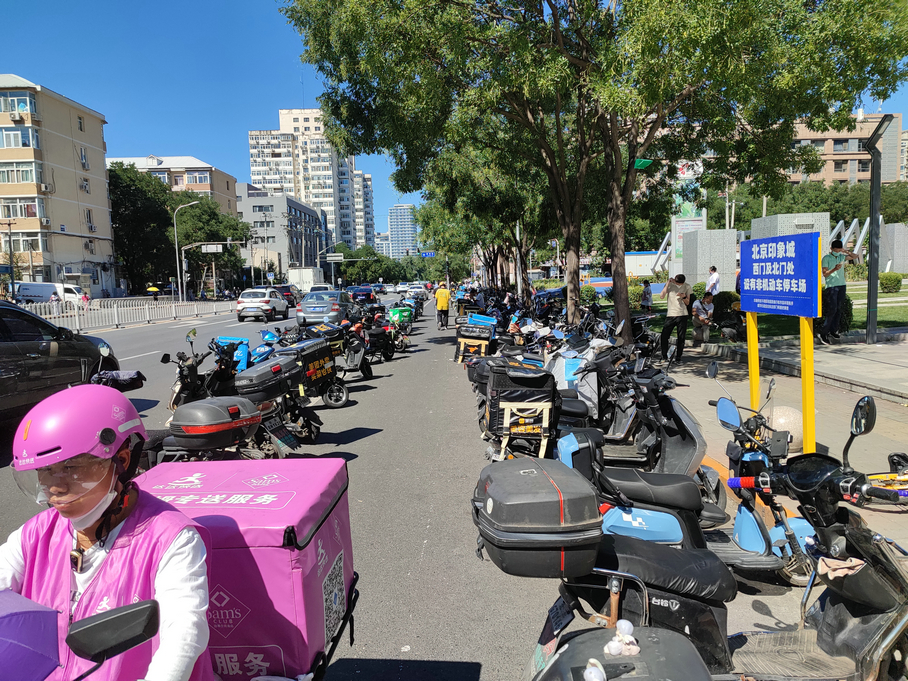 在印象城,路边停放的外卖车完全可以把车停进规定区域。骑手之所以不这么做,只是“图省事”。商场西门一进入就有一个扶梯,方便前往各楼层取餐。而如果走北门,则离电梯稍远。