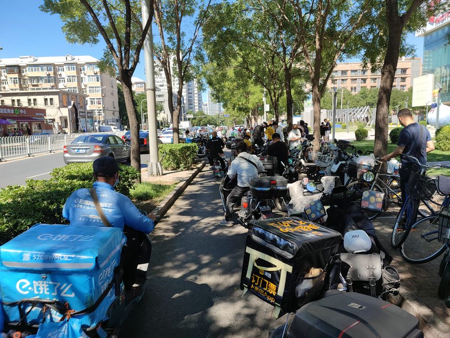 印象城商场西门外非机动车道,成了外卖车停车场