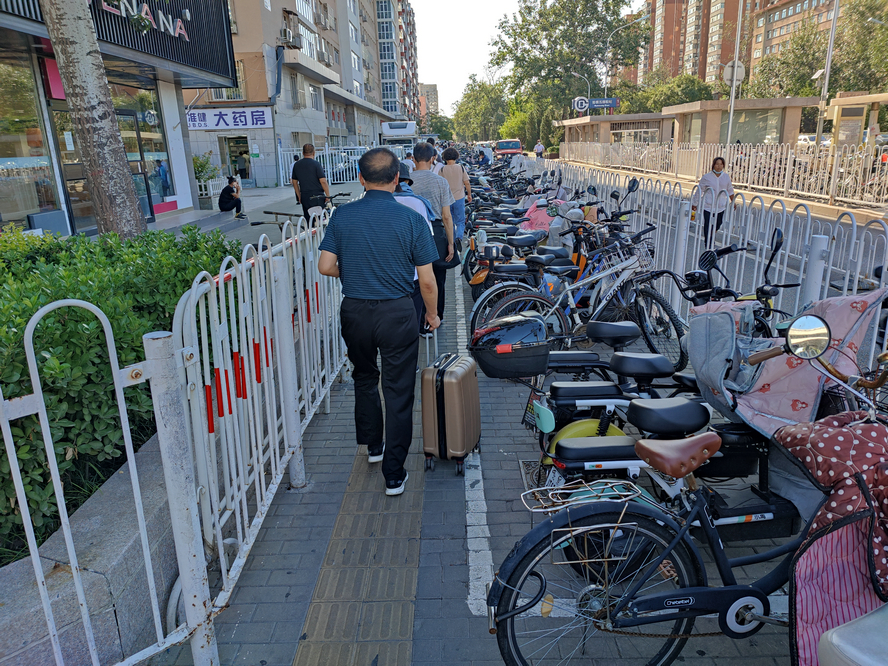 五棵松地铁站外便道,因为设置了停车区,步行空间被严重压缩
