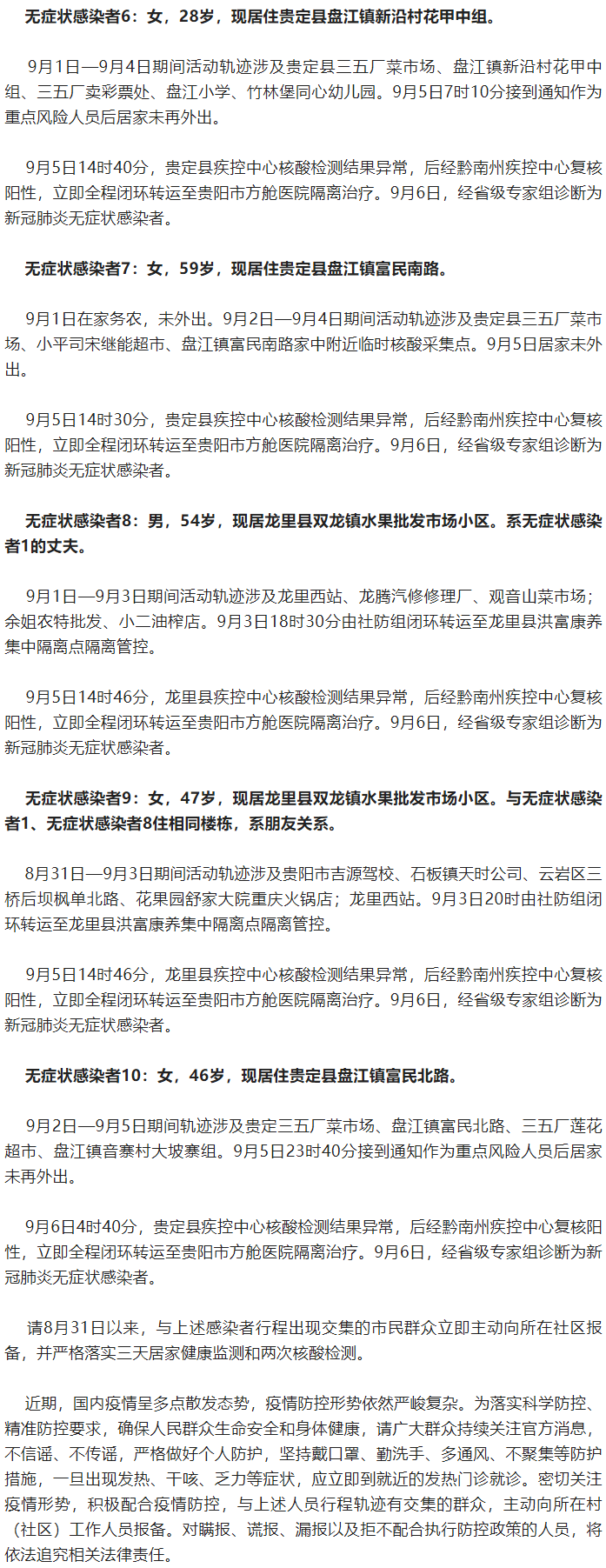2022年9月6日,接黔南州卫生健康局报告,贵定县3名重点区域核酸筛查人员和龙里县2名已隔离管控的人员新冠病毒核酸检测结果异常。9月6日,经省级专家组诊断为新冠肺炎无症状感染者。 目前,流调溯源、核酸筛查、隔离观察、环境消杀等应急处置工作正有序开展。