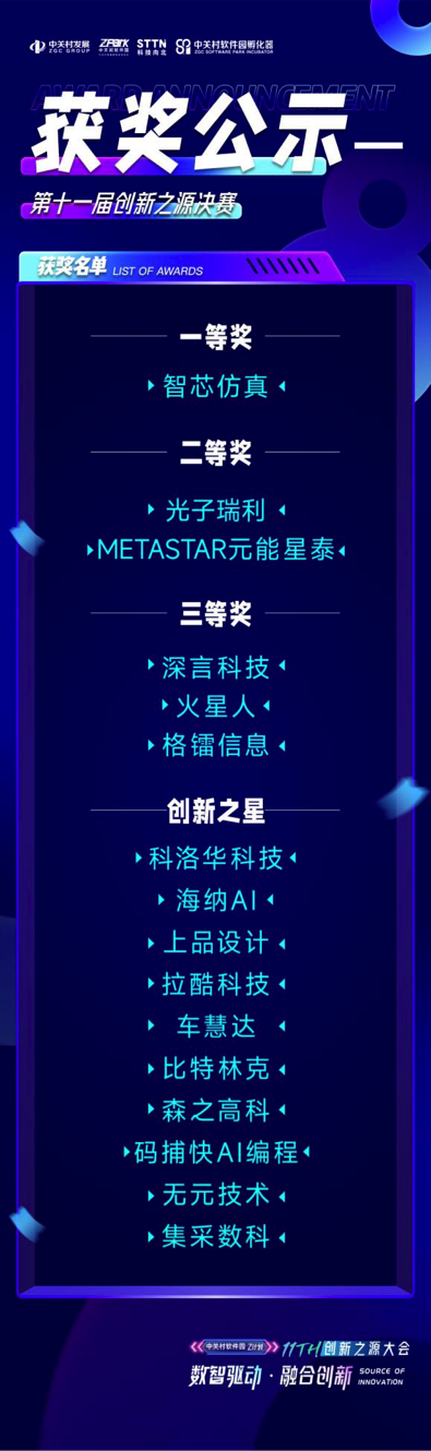 经过将近4个小时激烈角逐,北京智芯仿真科技有限公司获得一等奖,光子瑞利科技(北京)有限公司、广东元能星泰孪生科技创新有限公司获得二等奖,北京深言科技有限责任公司、北京火星人视野科技有限公司、北京格镭信息科技有限公司获得三等奖,科洛华医疗科技(北京)有限公司、北京群星闪耀科技有限公司等十家企业获得创新之星奖。