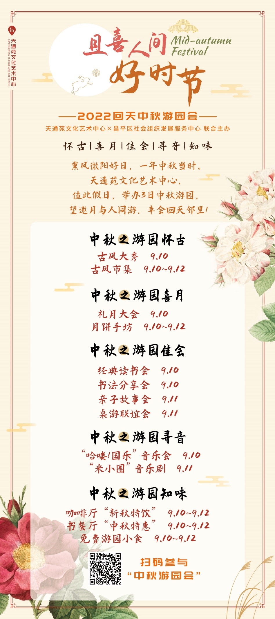 中秋节期间,昌平区天通苑文化艺术中心将举办中秋游园会,可以赏古风、听国乐、做手工月饼、写传统书法、穿汉服去古风市集上游赏,和家人一起度过中秋的美好时光。