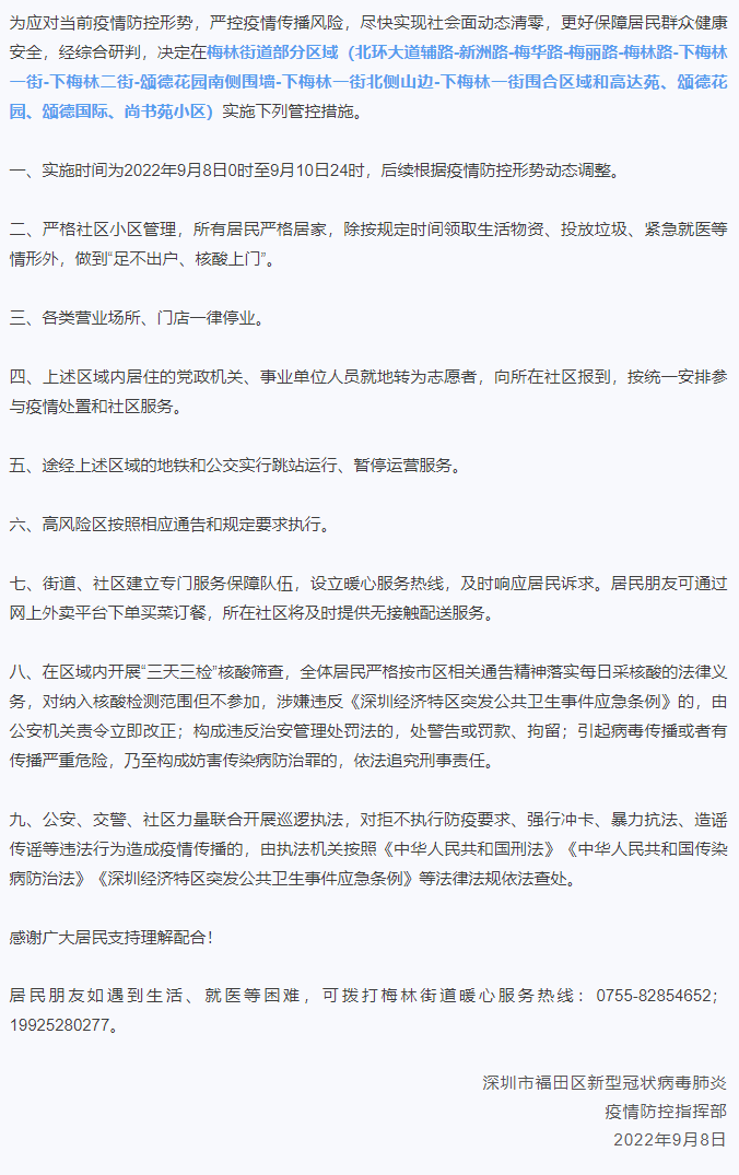 自9月7日起,将福田区辖区的福田街道相关区域和措施调整如下: