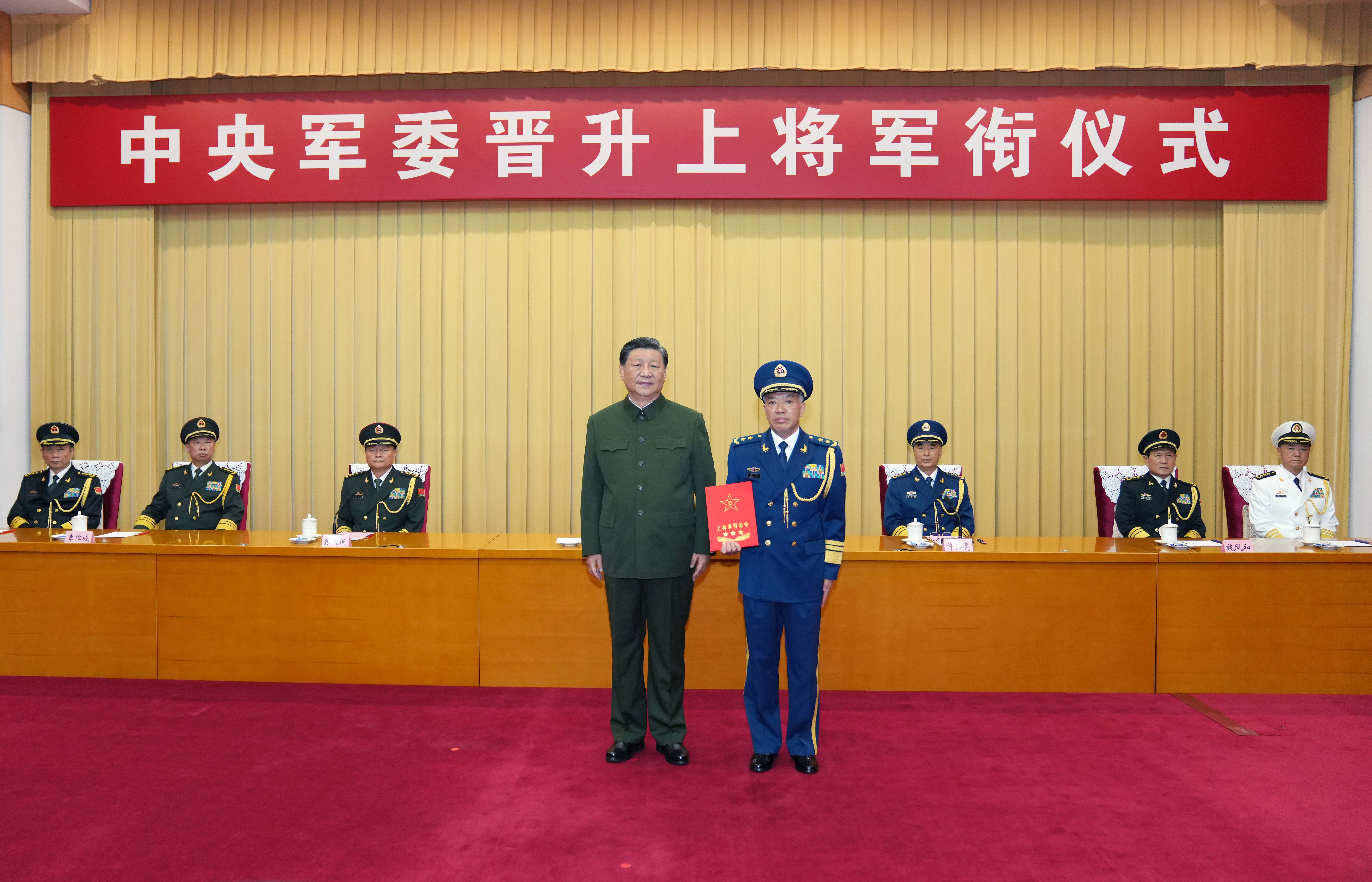 上午11时许,晋衔仪式在庄严的国歌声中开始。中央军委副主席许其亮宣读了中央军委主席习近平签署的晋升上将军衔命令。中央军委副主席张又侠主持晋衔仪式。