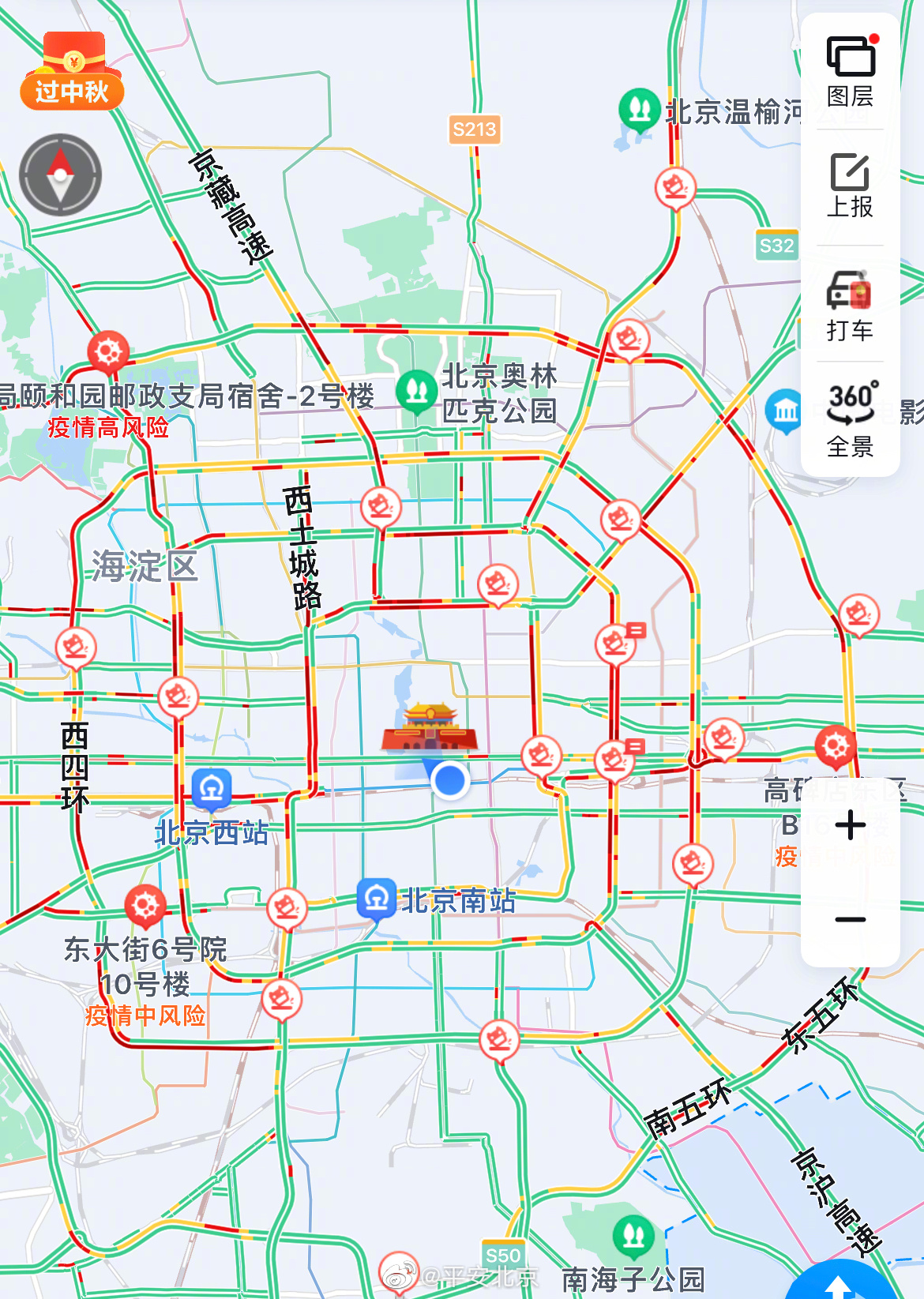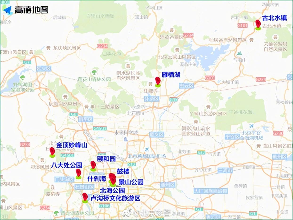 9月9日下午,@北京交警 发布出行提示,假期下午至晚间时段,去往卢沟桥地区、古北水镇、鼓楼、雁栖湖、什刹海等地区赏月的市民朋友较多,景山至地安门周边区域以及连接城区的京港澳、京承等高速公路车流量增多,京港澳高速可能出现下午出京、晚间进京的车流高峰。
