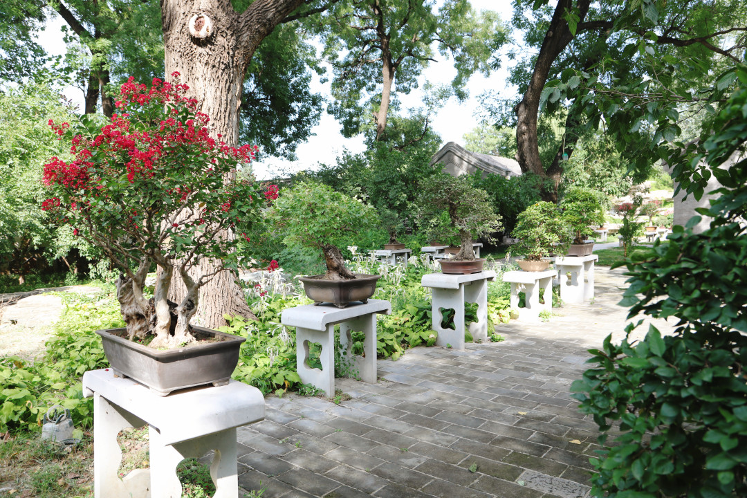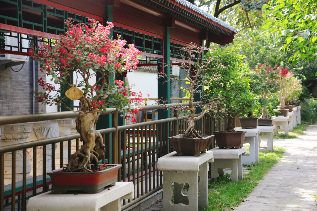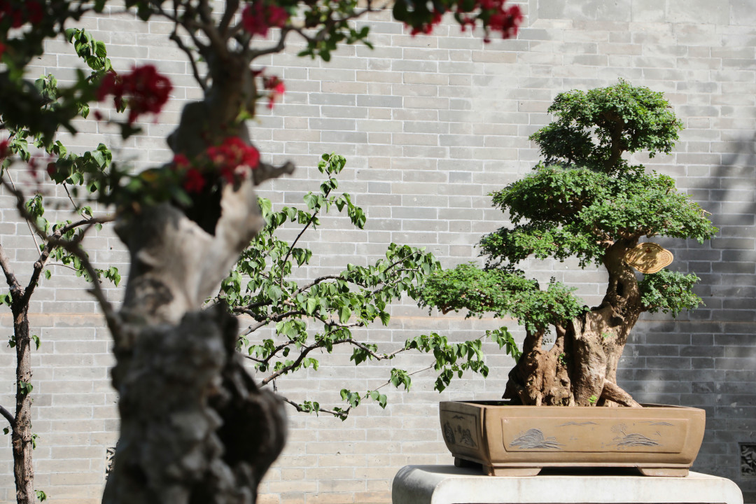 此外,各大门区和主要院落展摆了紫薇等大型花木盆景;耕织图水操学堂内,还集中展示了盆景展。