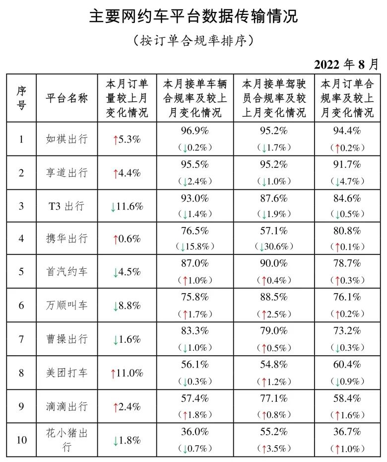 一、在订单量前10名的网约车平台中,订单合规率最高的是如祺出行,最低的是花小猪出行。在订单量前10名的平台中,按订单合规率(指驾驶员和车辆均获得许可的订单量占比)从高到低的分别是如祺出行、享道出行、T3出行、携华出行、首汽约车、万顺叫车、曹操出行、美团打车、滴滴出行、花小猪出行。本月订单合规率增长前3名的依次是滴滴出行、花小猪出行、首汽约车;增长最后3名的依次是T3出行(-0.5%)、美团打车(-0.9%)、享道出行(-4.7%)。