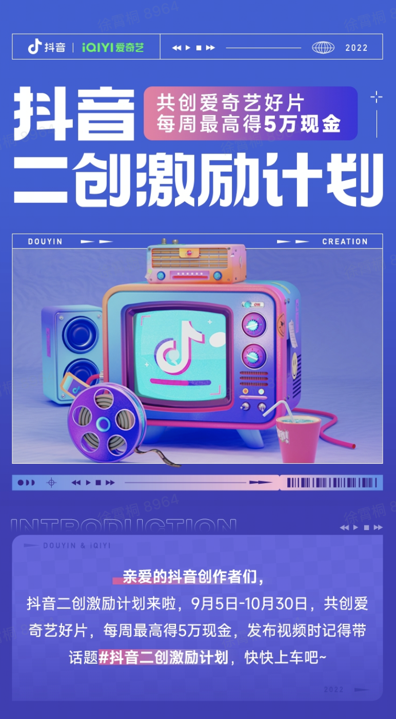 记者9月13日从抖音获悉,平台近期发布了针对爱奇艺合作片单的二创激励计划,面向影视综创作者征稿,共创爱奇艺好片,奖励包含流量激励和现金激励,创作者每周有机会获得最高价值3万元的DOU+满赠券、5万元现金。