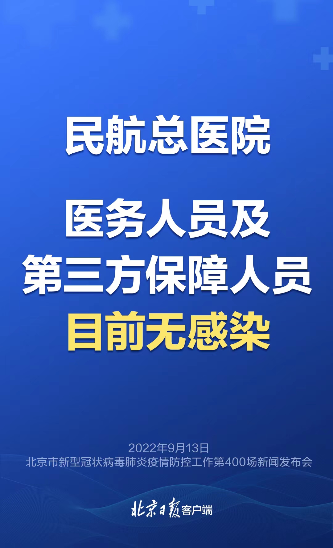 9月13日,在北京市新型冠状病毒肺炎疫情防控工作第400场新闻发布会上,民航总医院副院长万刚介绍,目前无医务人员及第三方保障人员感染。