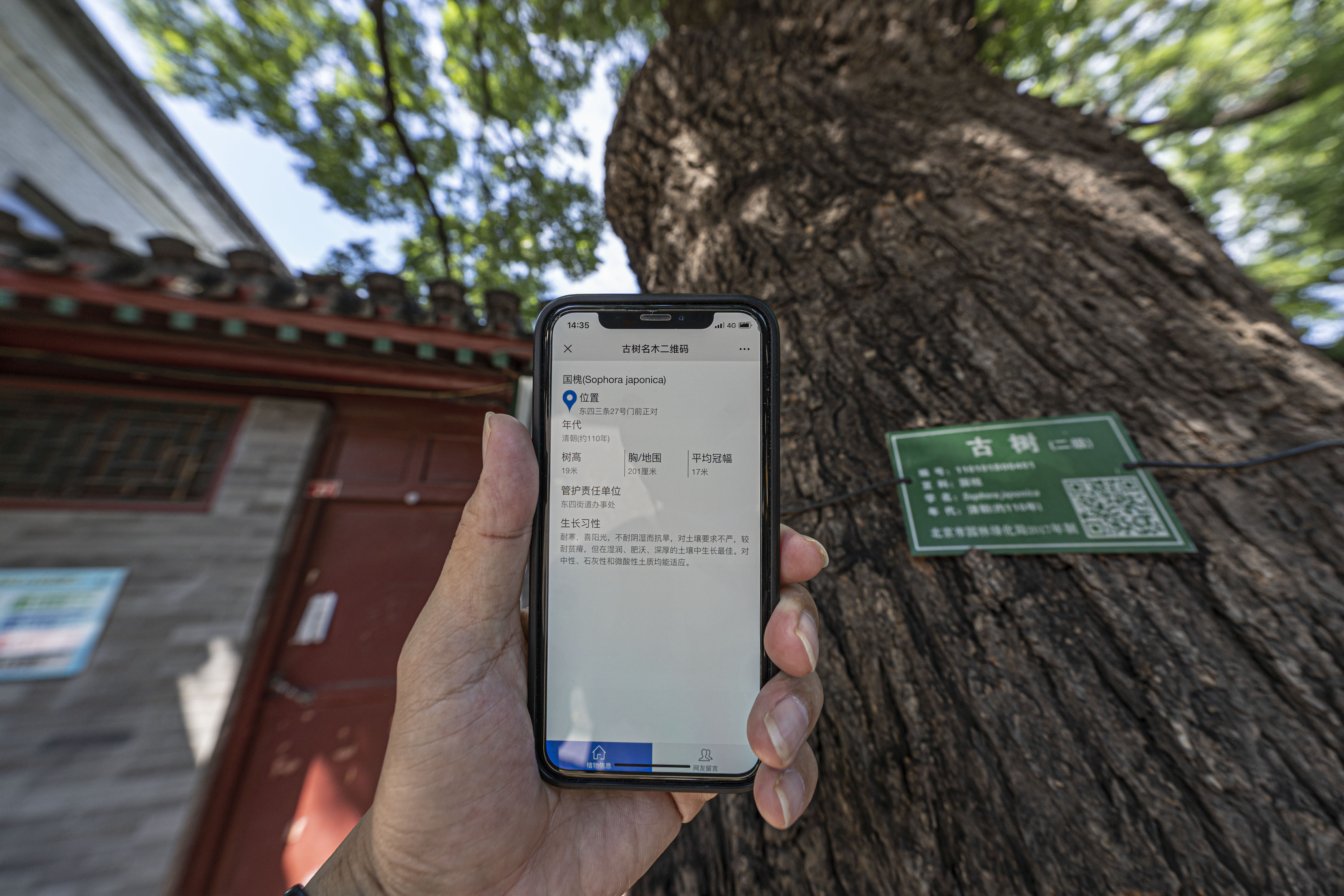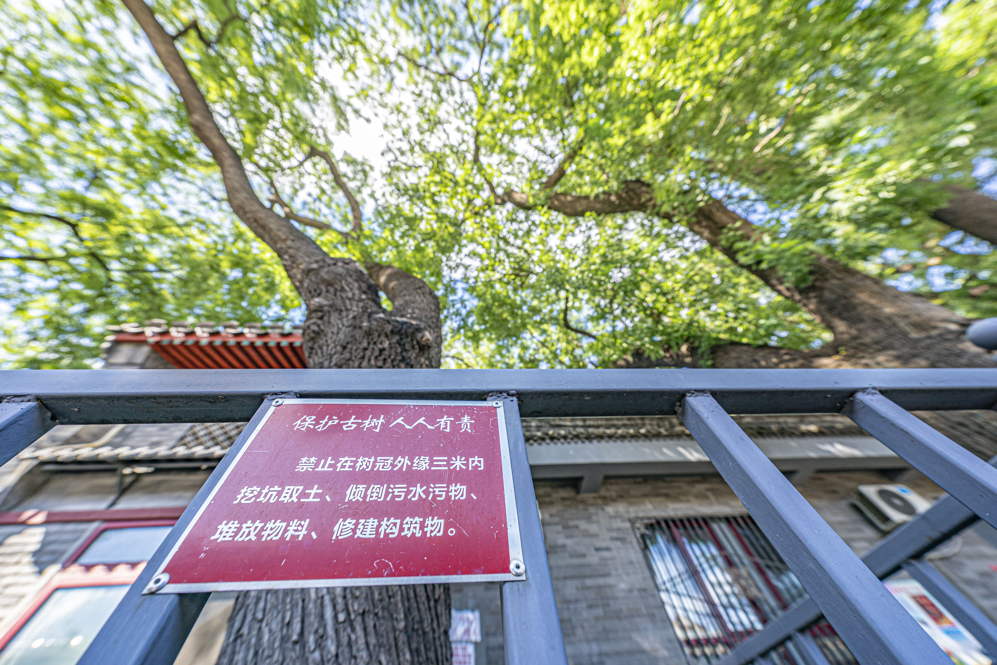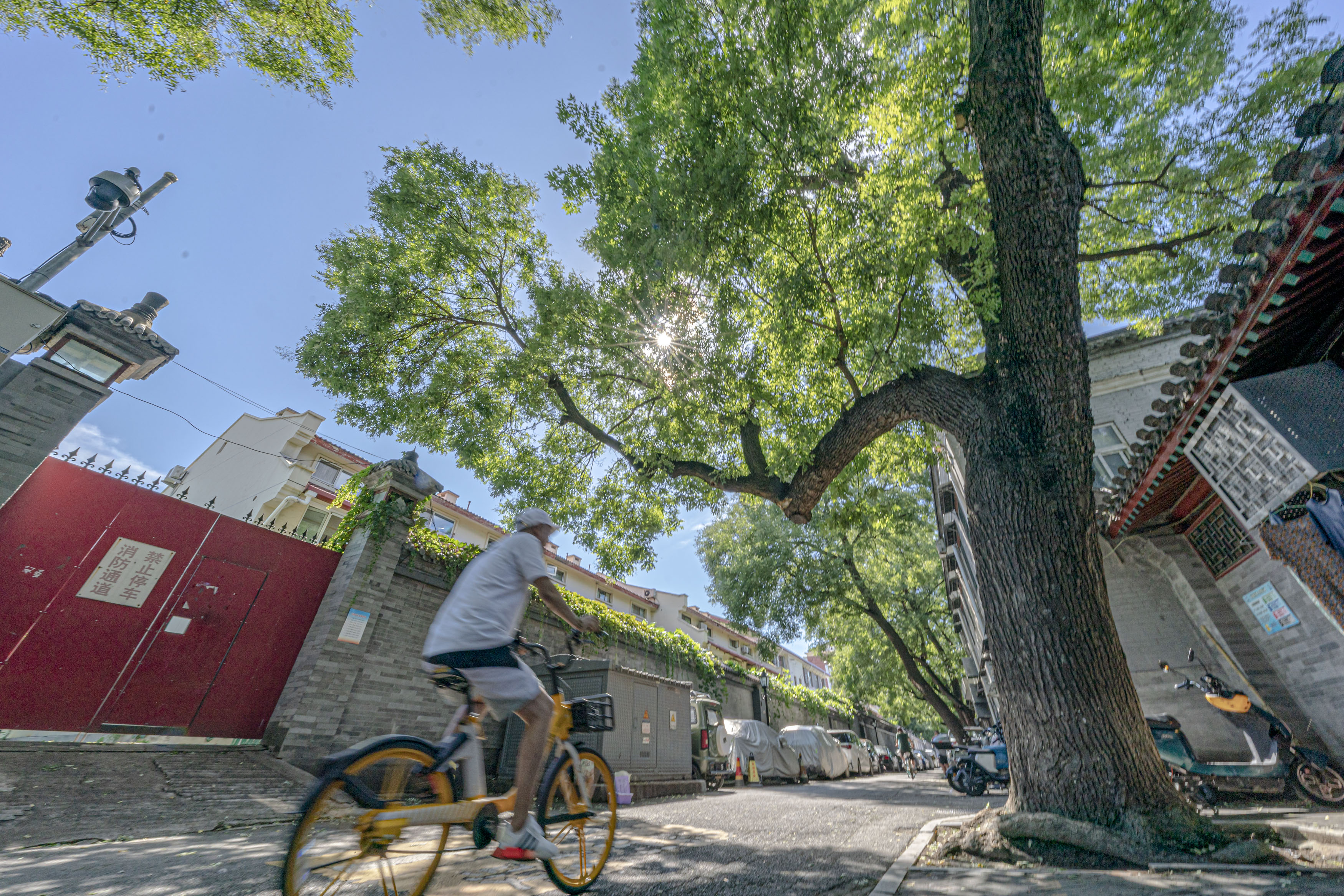 作为北京最古老的街区之一,东四三条胡同距今已有750多年历史。胡同长700余米,宽8米,两旁林立着20株百余年树龄的国家二级古树——国槐,平均冠幅17米,平均树高达26米,两侧树冠相交,如一张张巨大的绿伞。绿意掩映着青砖灰瓦、朱门楹联,成为东四三条的独特风景。目前,很多古树周围设了保护围栏,树干上挂着“身份铭牌”,扫描铭牌上的二维码,古树的具体位置、年代、树高、平均冠幅、生长习性等信息可清晰浏览。
