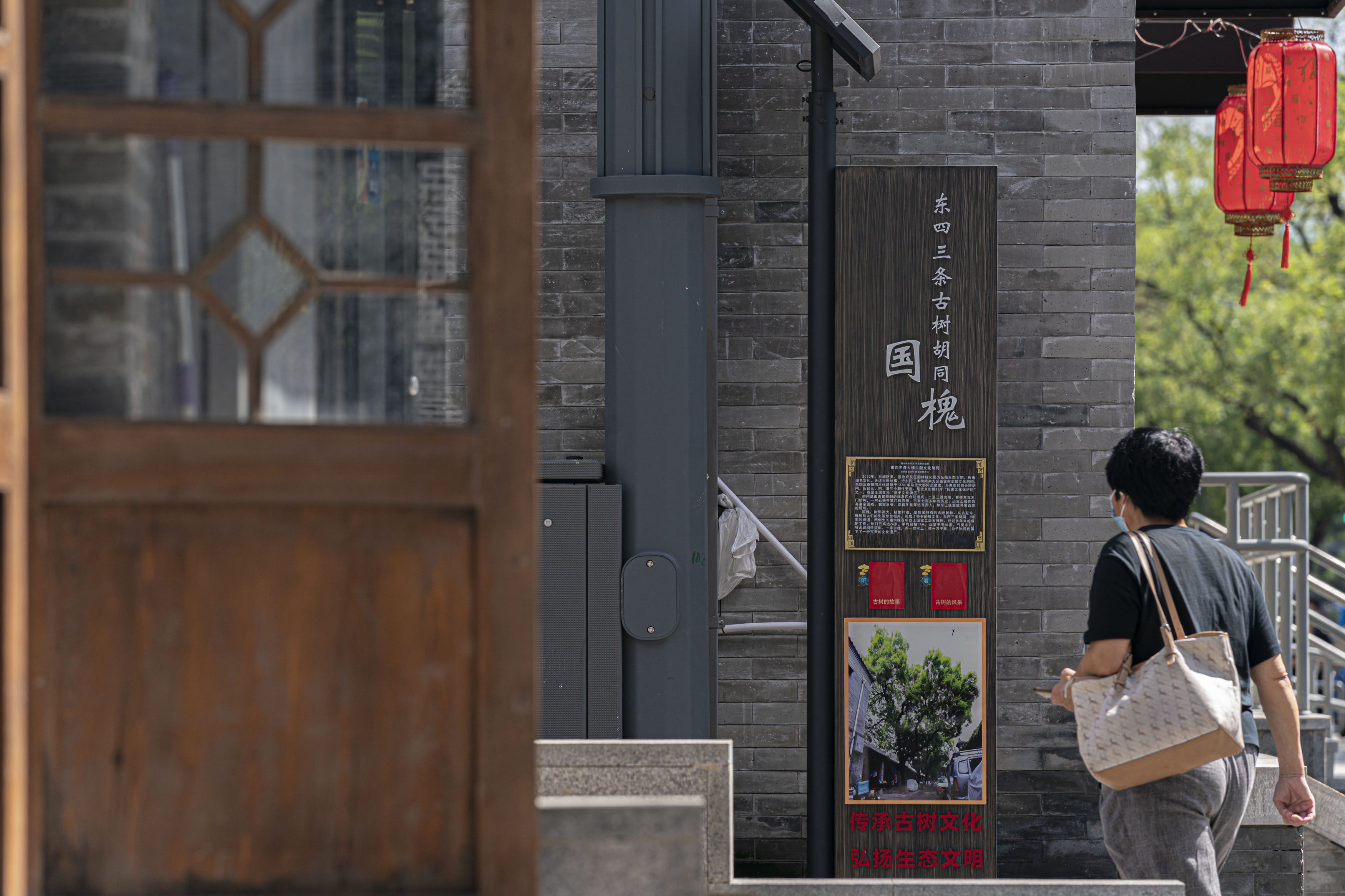 除了复壮古树,东四三条还增设了不少古树相关的路牌导视。在胡同东西口,两块古香古色的路牌导视融合了古树文化与胡同文化,上面详细描述了胡同历史和古槐树的相关知识,“传承古树文化,弘扬生态文明”的标语清晰可见。“这些古树穿过漫长的岁月,经历着时序的更替,记录着风物的变迁,是胡同的特有标志。我们将路牌导视与文化景观结合,使古树历史文化知识以景观形式融入居民日常生活。”相关负责人说,下一步,东城区还将在路牌导视上增加“听”和“看”的二维码,市民扫码就能听古树故事。