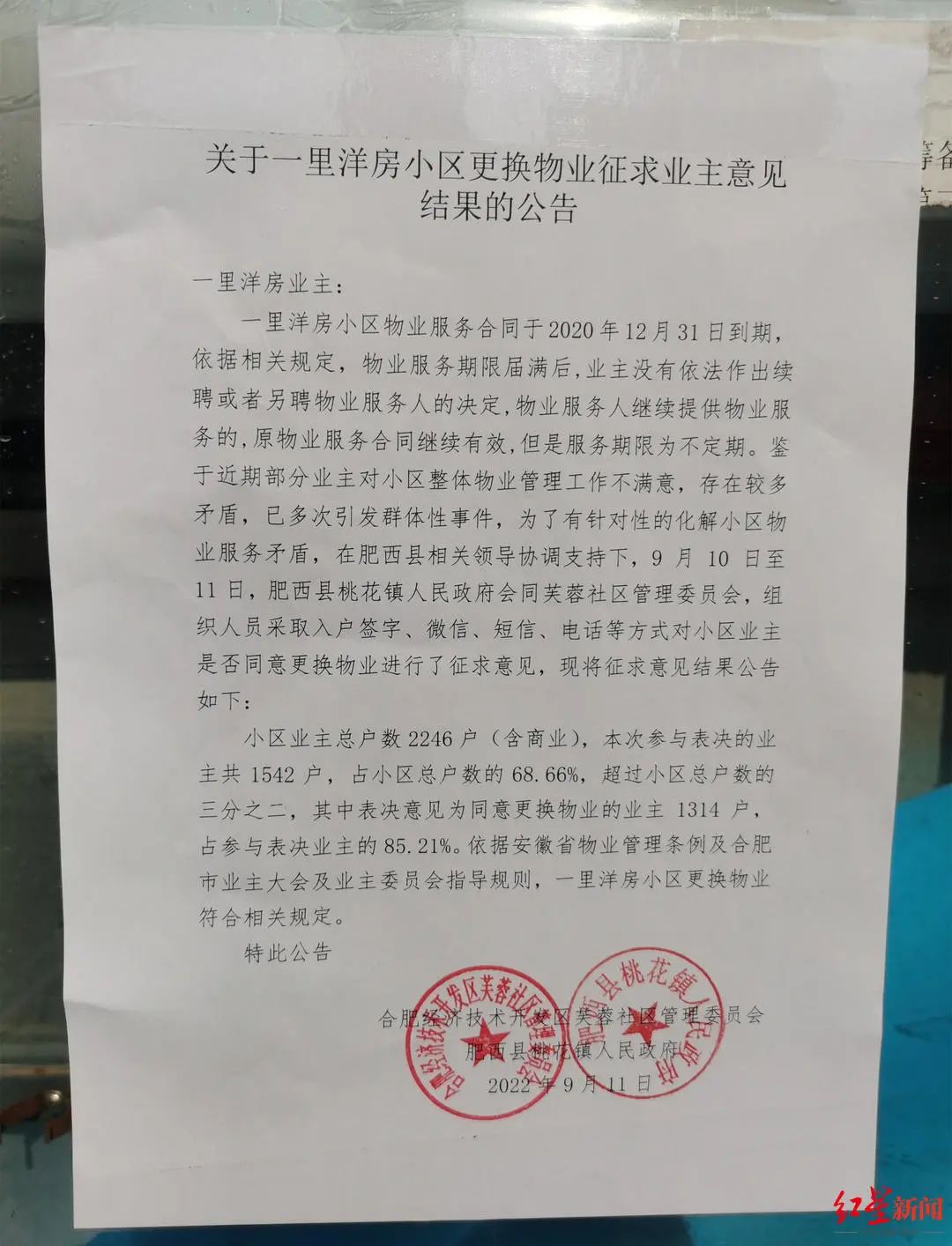 据顾先生提供的图片显示,9月10日,肥西县城管局对涉嫌违建的酒店下达《责令改正违法行为通知书》,要求在9月15日之前停止违法行为;9月11日,肥西县桃花镇政府及经开区芙蓉社区委员会联合发布关于一里洋房小区更换物业征求业主意见结果的公告:一里洋房小区更换物业符合相关规定。
