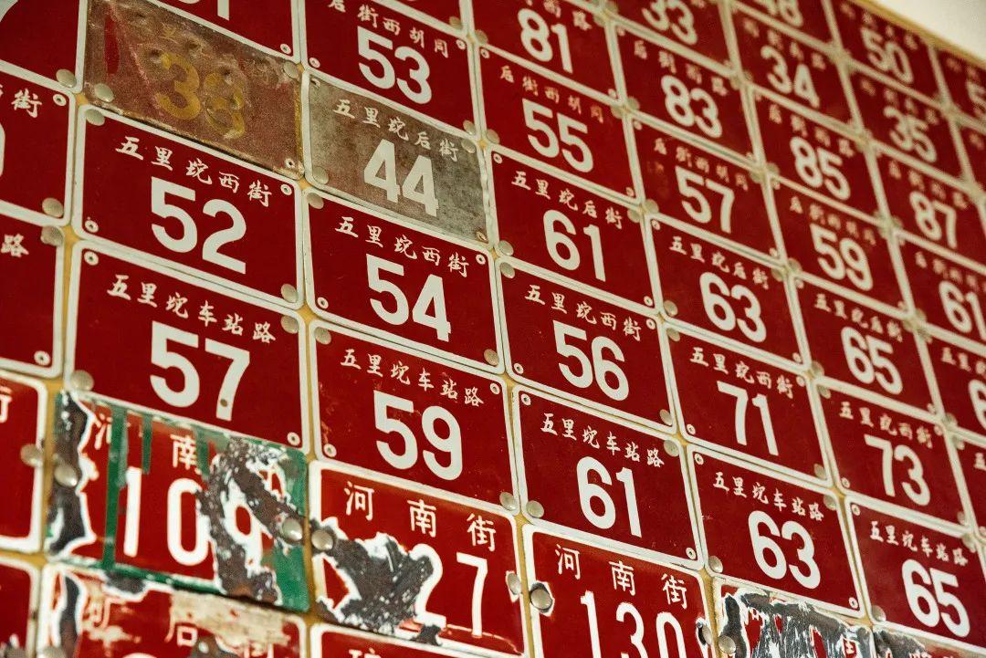 馆内有一面满是旧门牌的“红墙”。五里坨后街、五里坨车站路等门牌号背后的斑驳记忆,在这铺开。