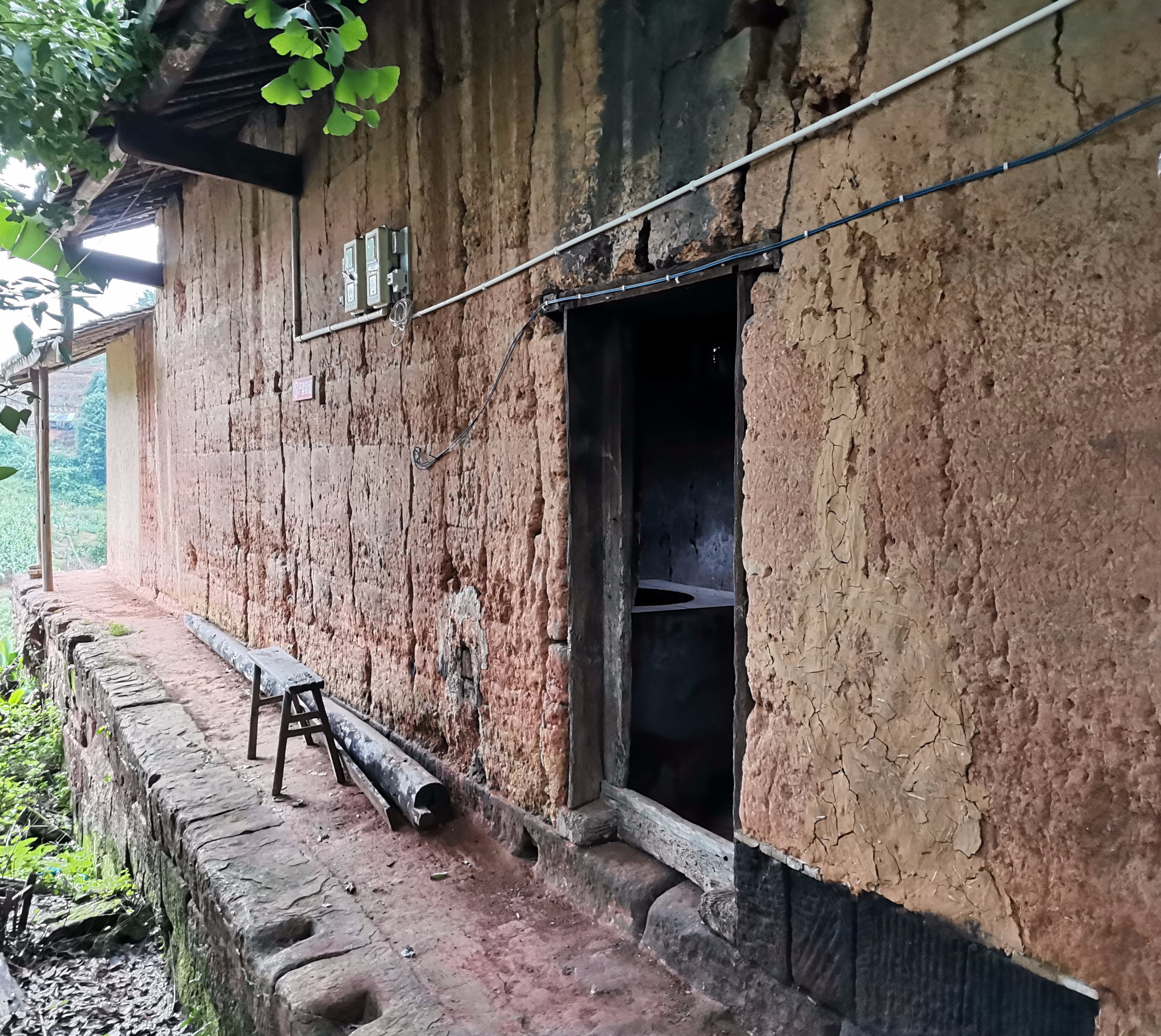 这栋土墙的房子,至少有两处时代的印迹。一处是土墙房子的脚边大约一米高的地方,糊的是水泥。完全与罗哲文的故居土墙房子不一样。罗哲文故居的土墙墙基是这方丹霞地貌开凿的红石,但土墙本身则无其他材料辅佐。而这户农户的土墙,除了墙基外,还在距红色条石上方一米处,糊了水泥。这让土墙有了格外的保护。再就是房檐滴水下的檐坎,也是用条石砌的,工工整整,一点也不潦草。