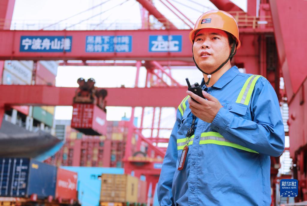 宁波舟山港北仑第三集装箱码头有限公司桥吊班大班长竺士杰在宁波舟山港码头工作(资料照片)。新华社发