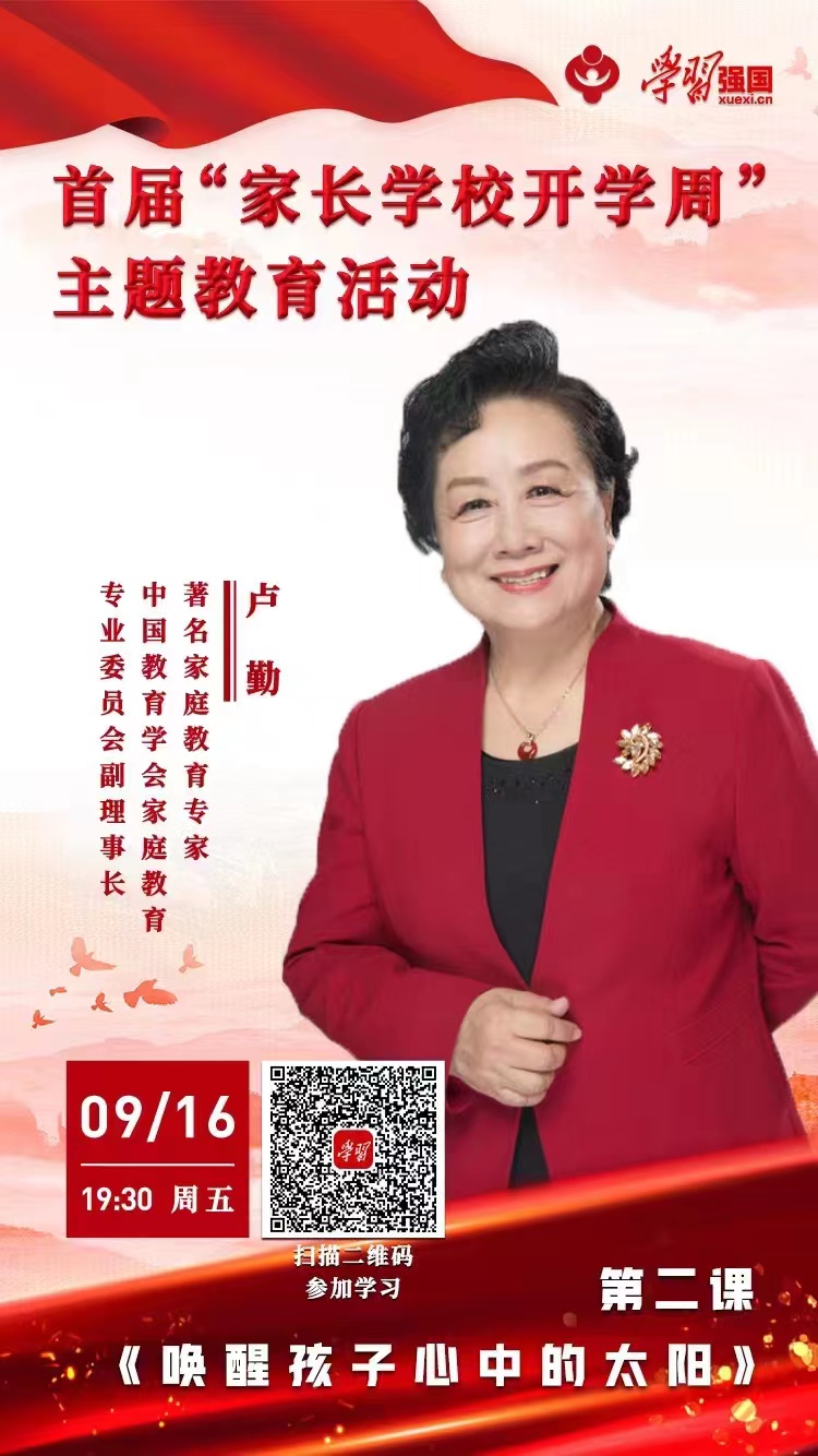 今晚19:30“学习强国”平台,影响三代人的家庭教育专家、著名“知心姐姐”卢勤老师,给我们带来了“家长学校开学周”第二课——《唤醒孩子心中的太阳》。