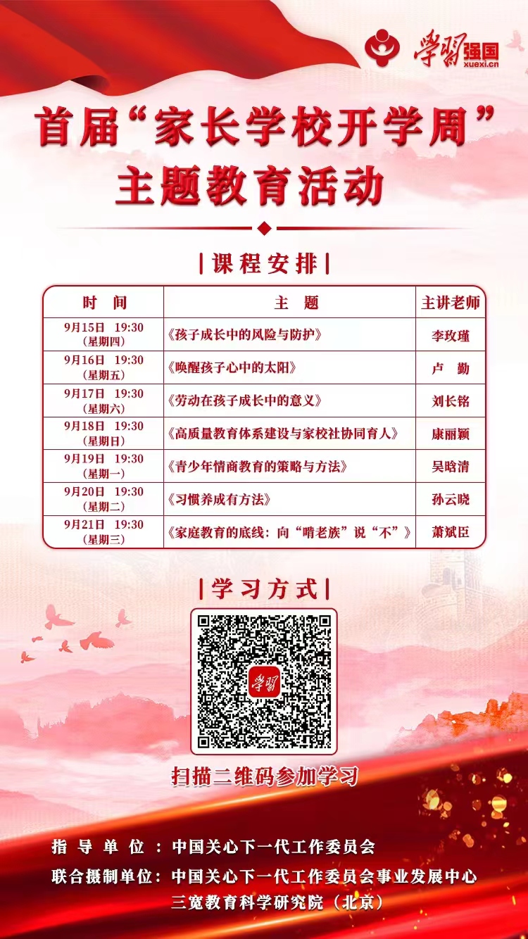 从9月15日至21日,每晚19:30。每天一位著名家庭教育专家为家长朋友们带来一场精彩的家庭教育公益讲座。
