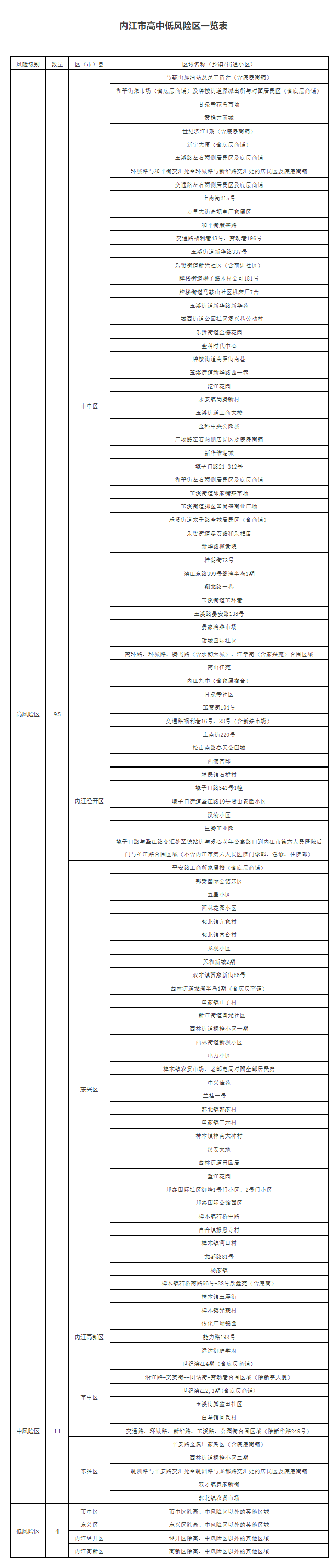 自2022年9月17日零时起,蓝滨城悦府小区(泸州市江阳区蓝田街道富民路1号)、蓝田街道农场巷71号楼及蒲草田(泸州市江阳区蓝田街道农场巷71号)的风险等级由高风险区调整为中风险区,泸州市江阳区蓝田街道东升桥社区除高、中风险区以外的其他区域的风险等级由中风险区调整为低风险区,江阳区其他区域风险等级不变。